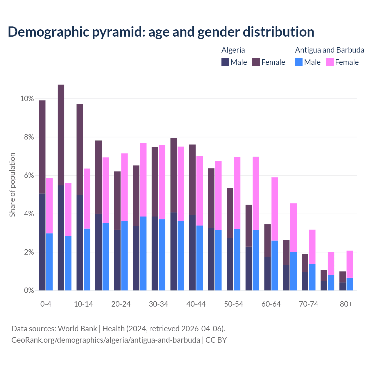 - Algeria is ranked 111/196 by median age (oldest to youngest) vs 67/196 for Antigua and Barbuda.