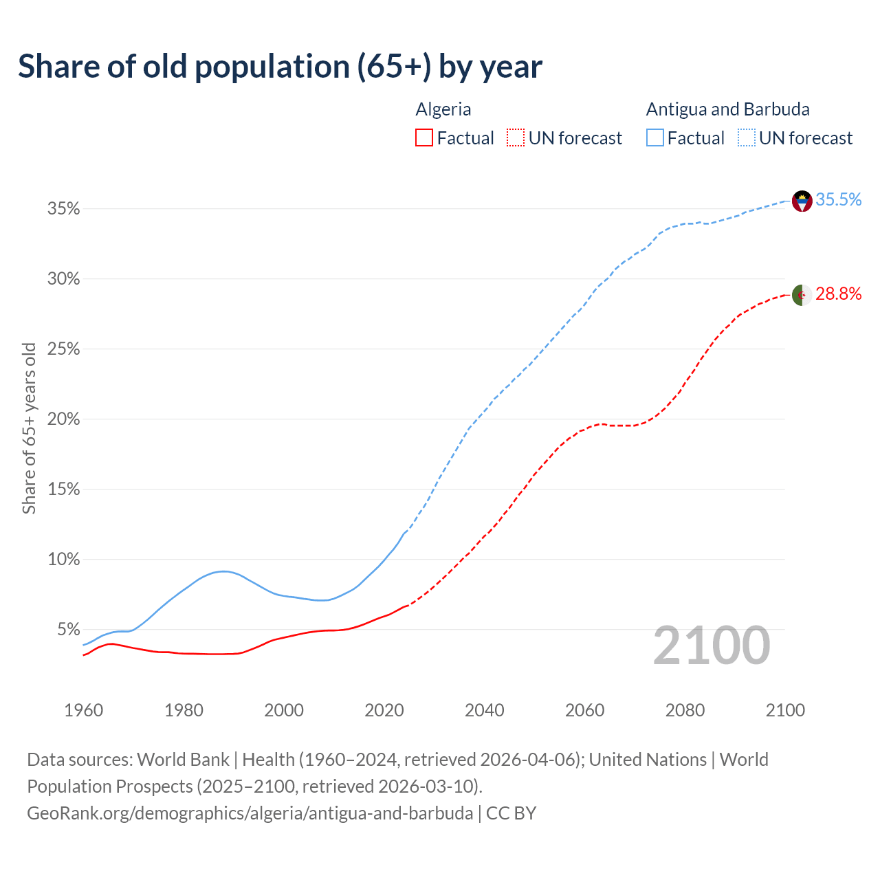 The share of older people aged 65 and over is 6.58% in Algeria and 11.8% in Antigua and Barbuda. Life expectancy in Algeria compared to Antigua and Barbuda .