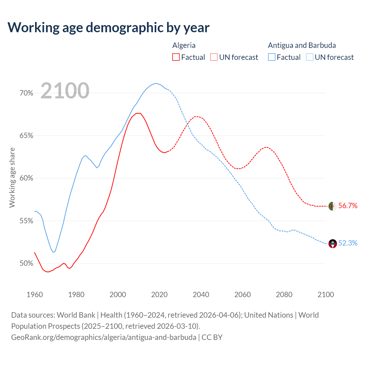 Median age Algeria vs Antigua and Barbuda, 1960-2100