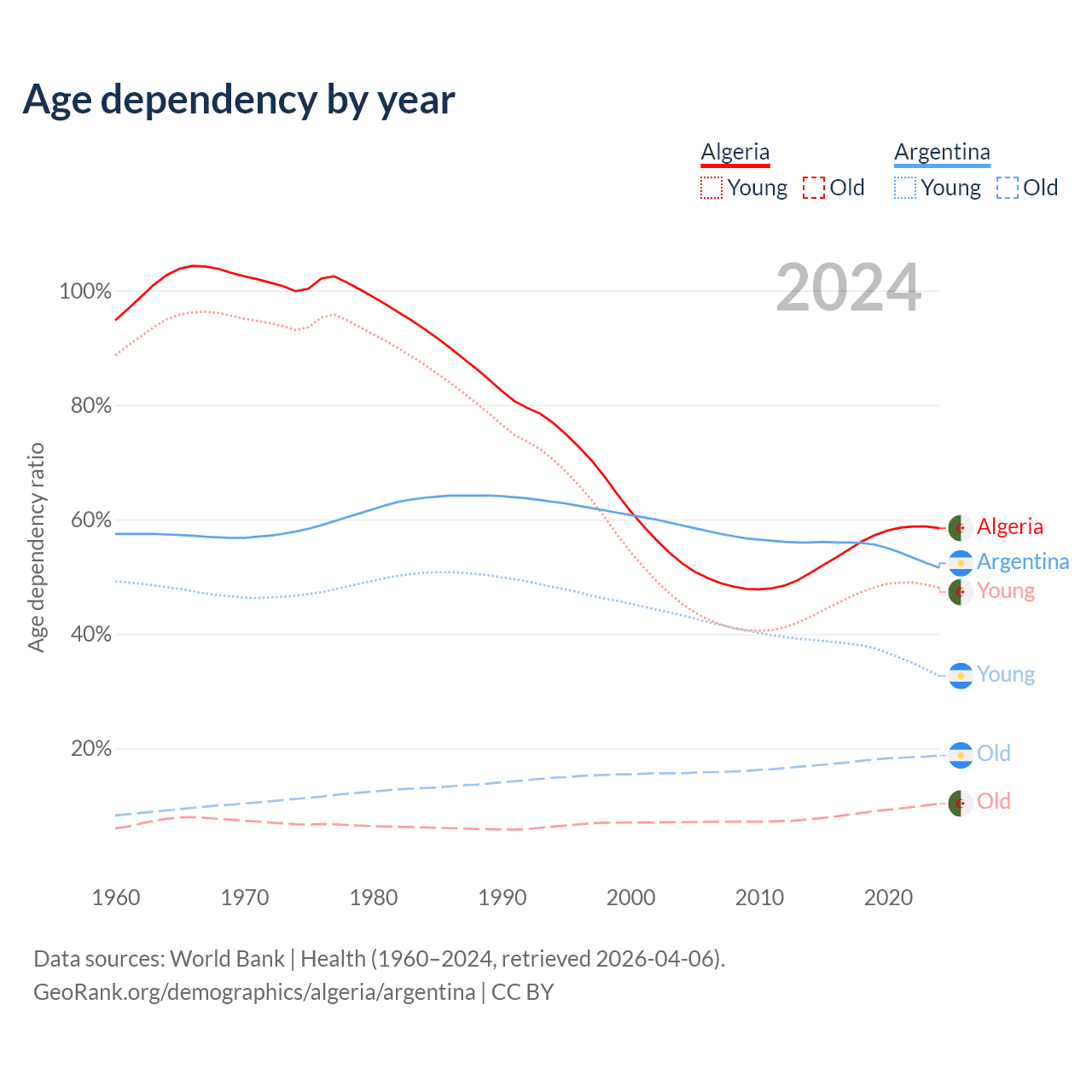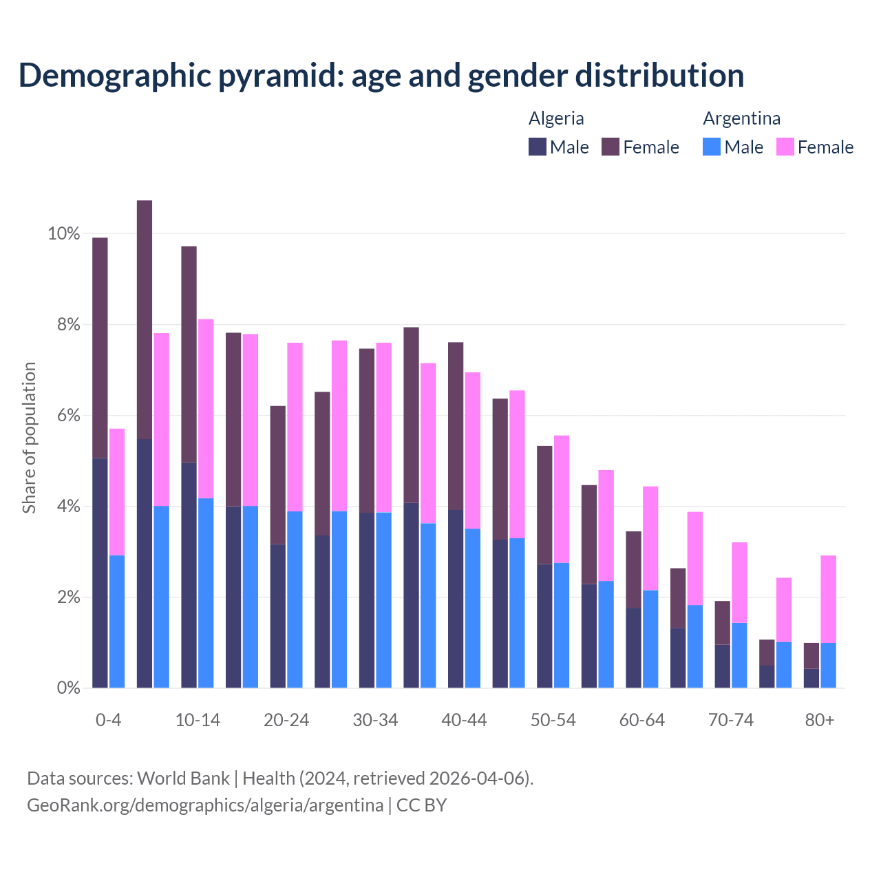 - Algeria is ranked 111/196 by median age (oldest to youngest) vs 85/196 for Argentina.