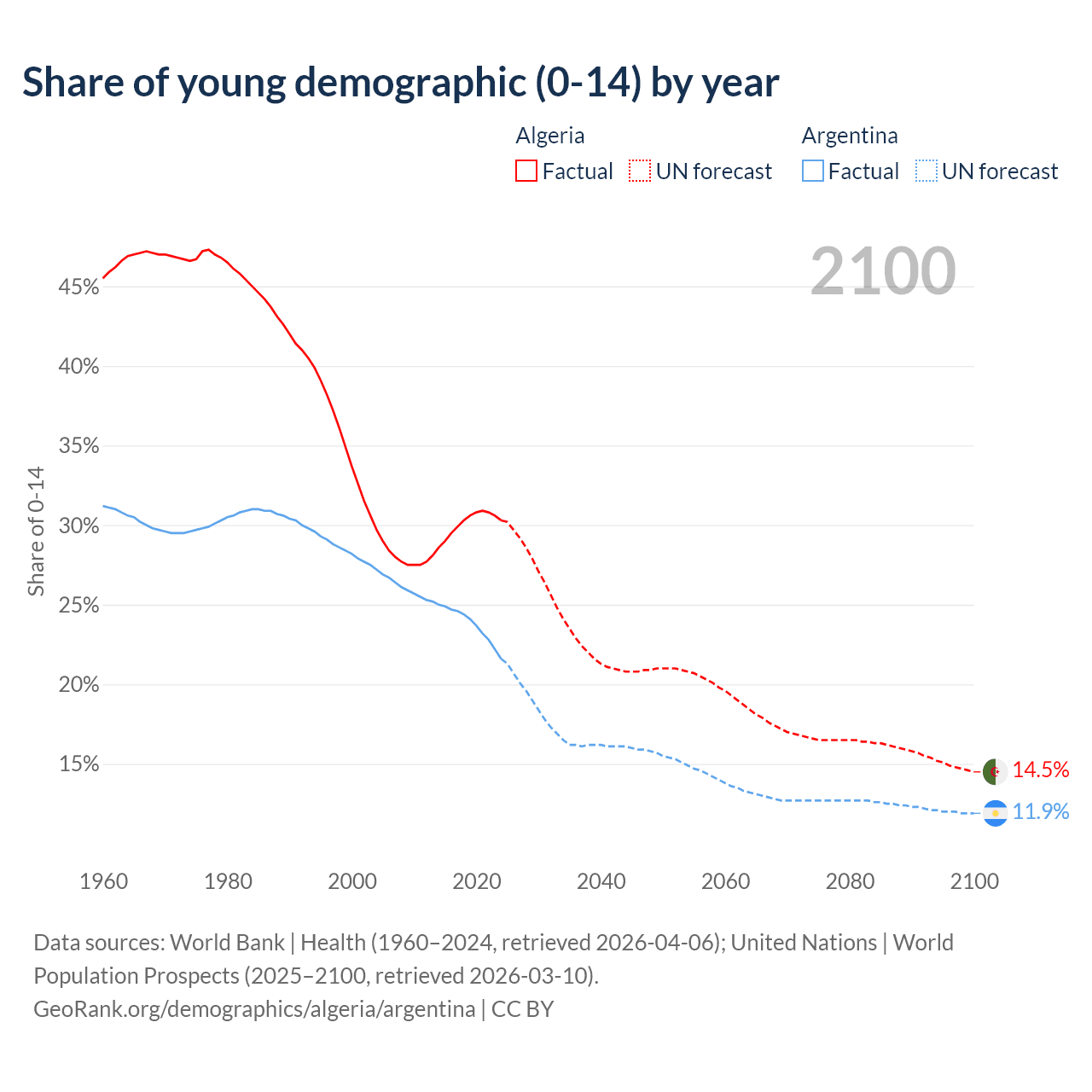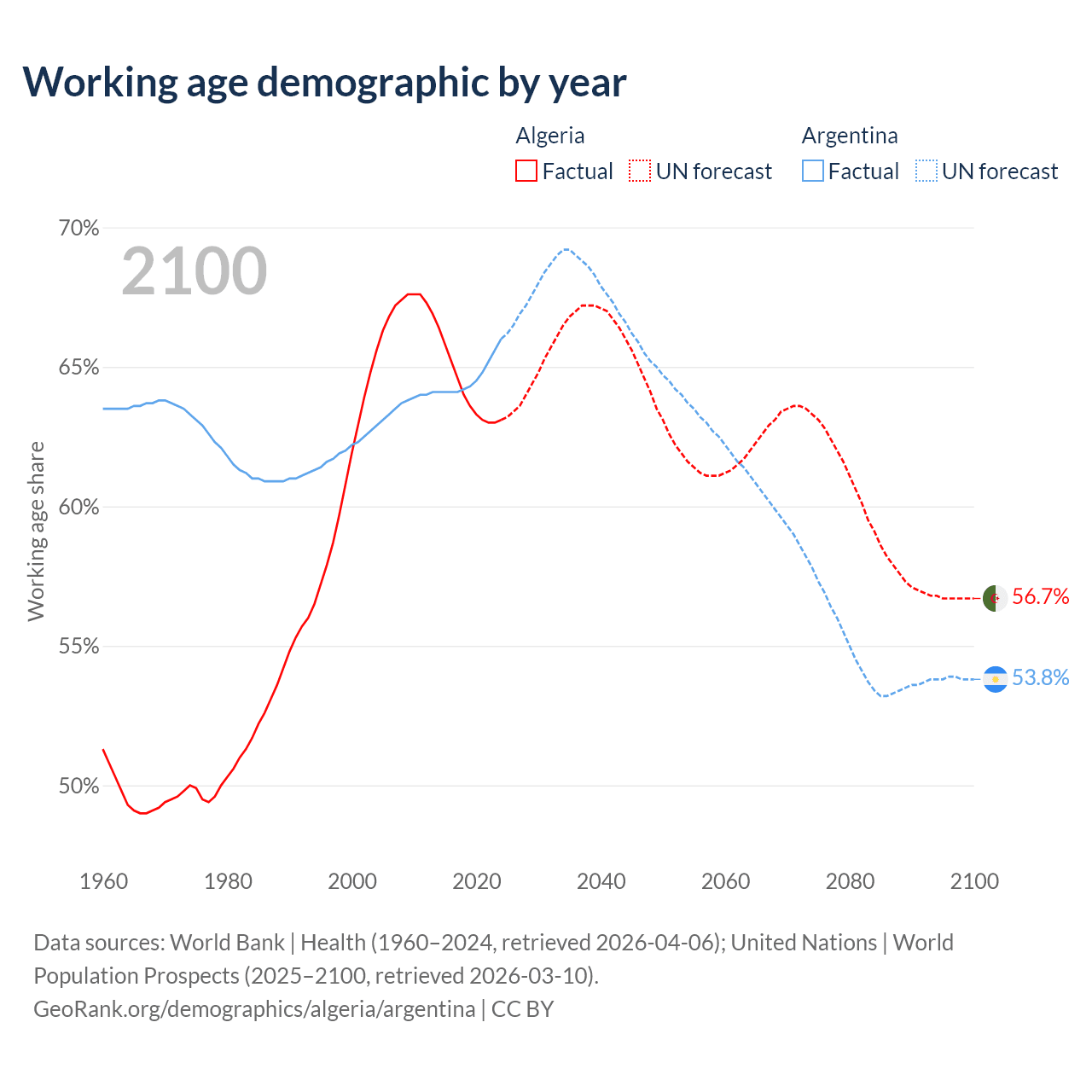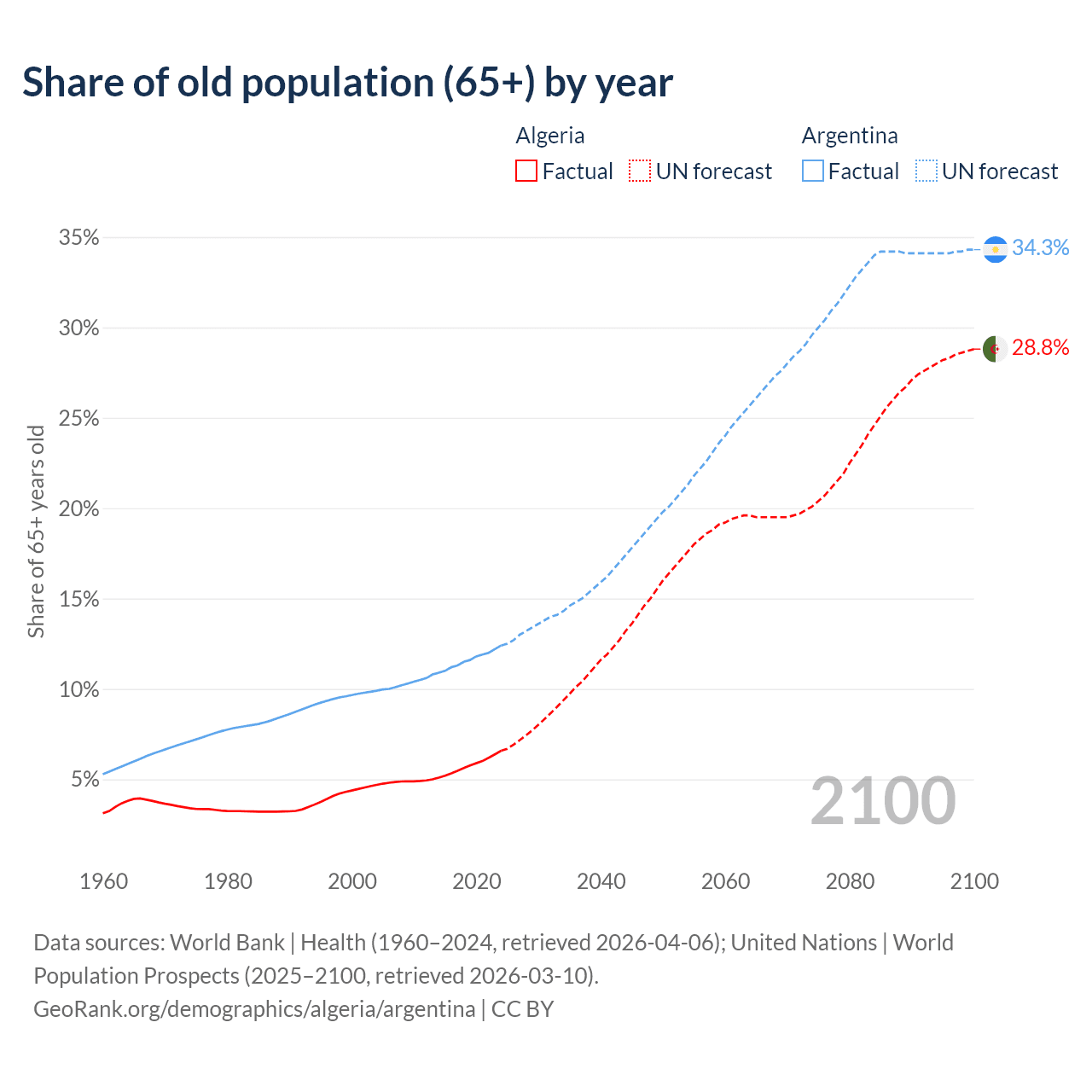 Median age Algeria vs Argentina, 1960-2100