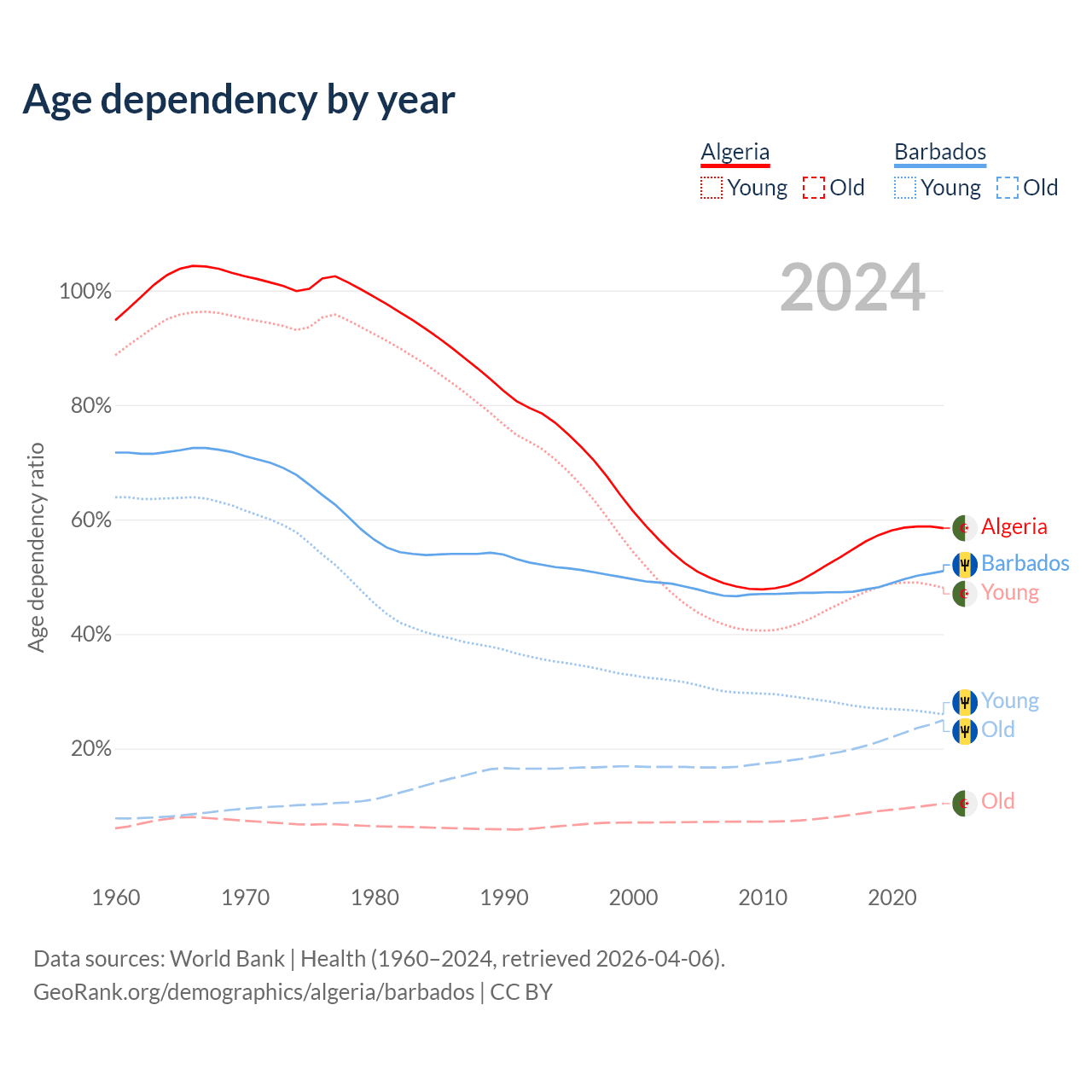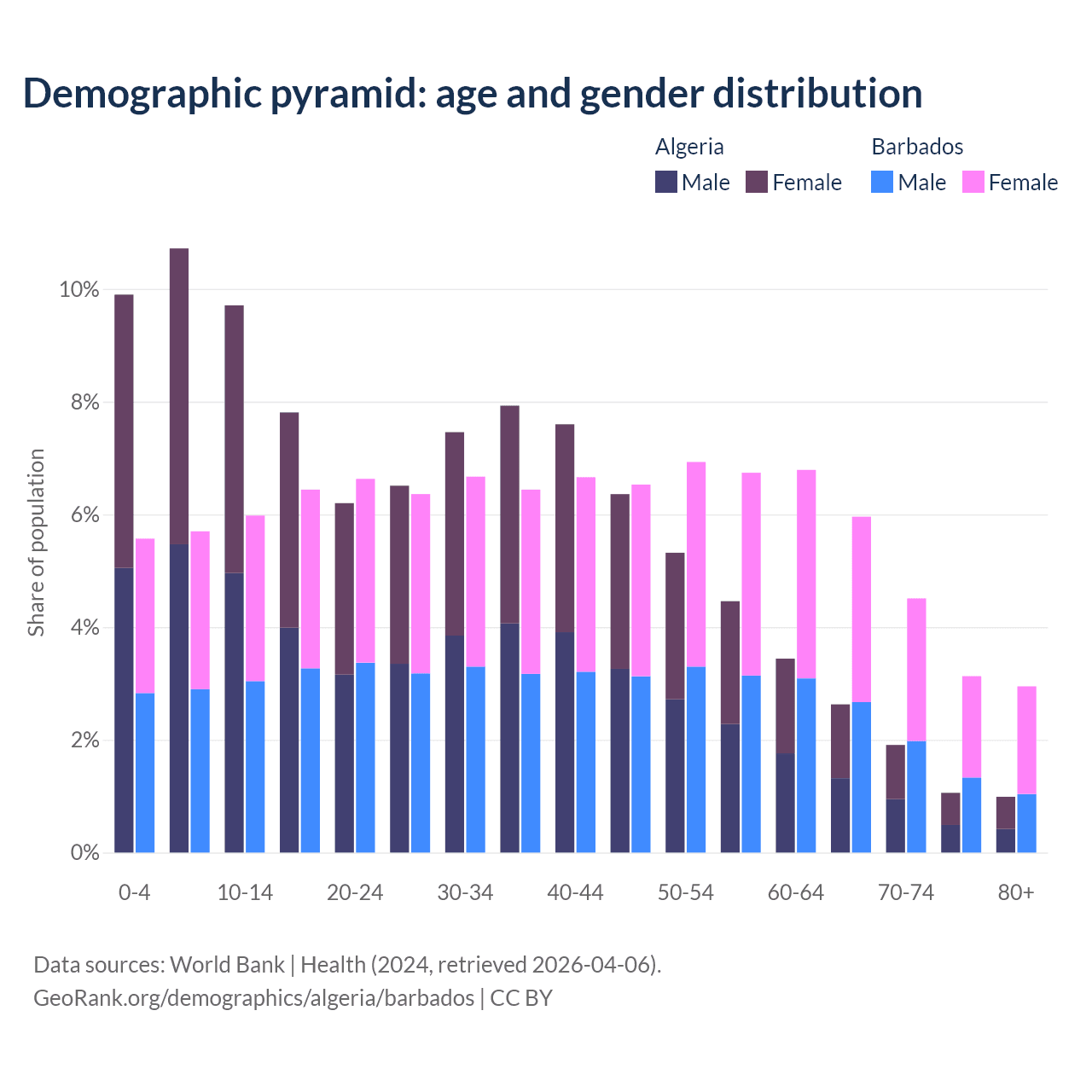 - The share of old-age demographic (65+) in Algeria is 6.58% vs 16.6% in Barbados.