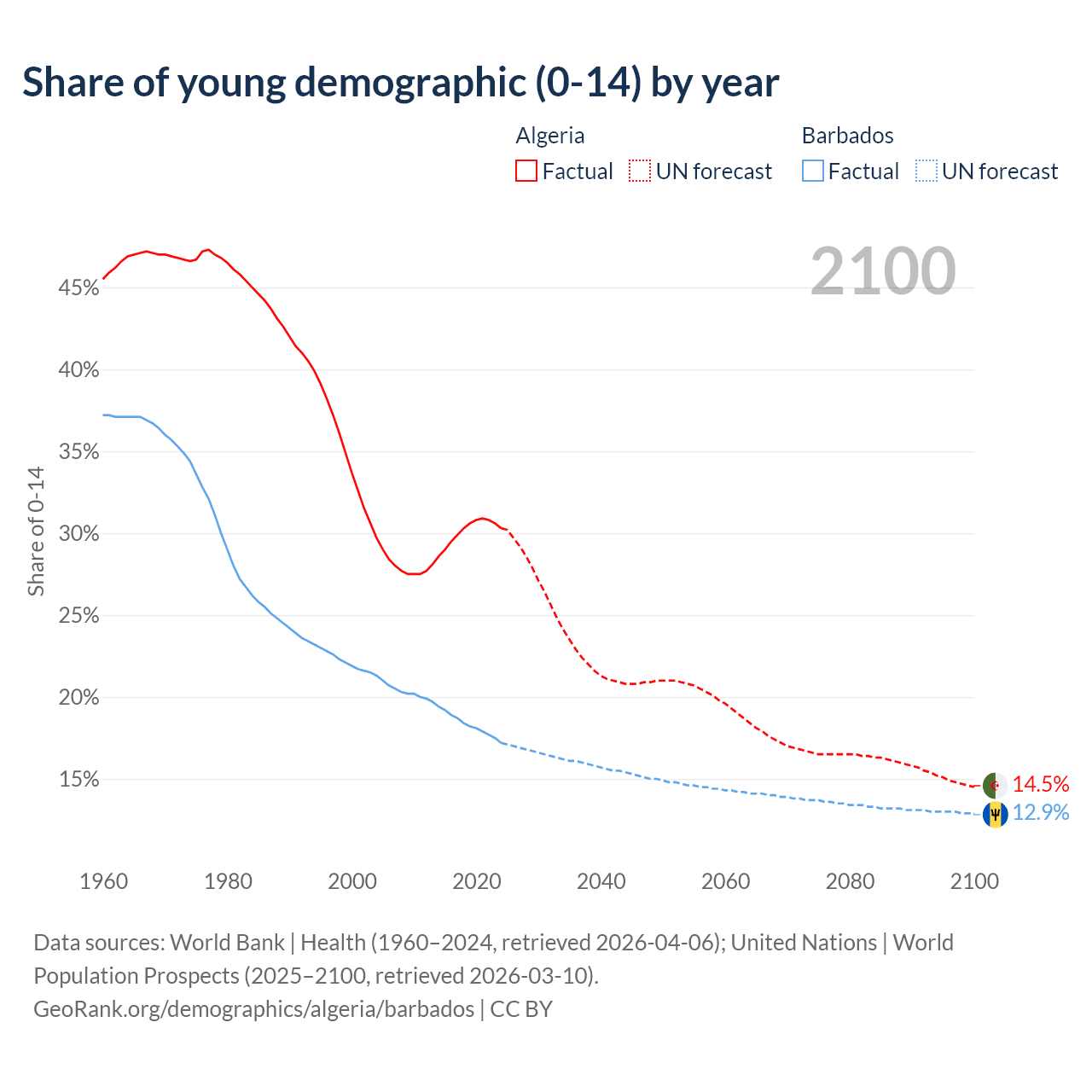 - The share of young demographic (0-15 years old) in Algeria is 30.3% vs 17.2% in Barbados.