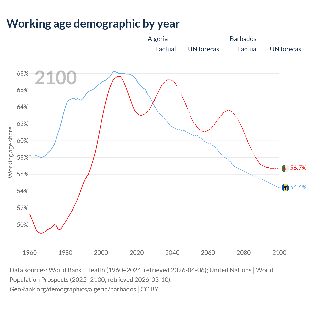 Median age Algeria vs Barbados, 1960-2100