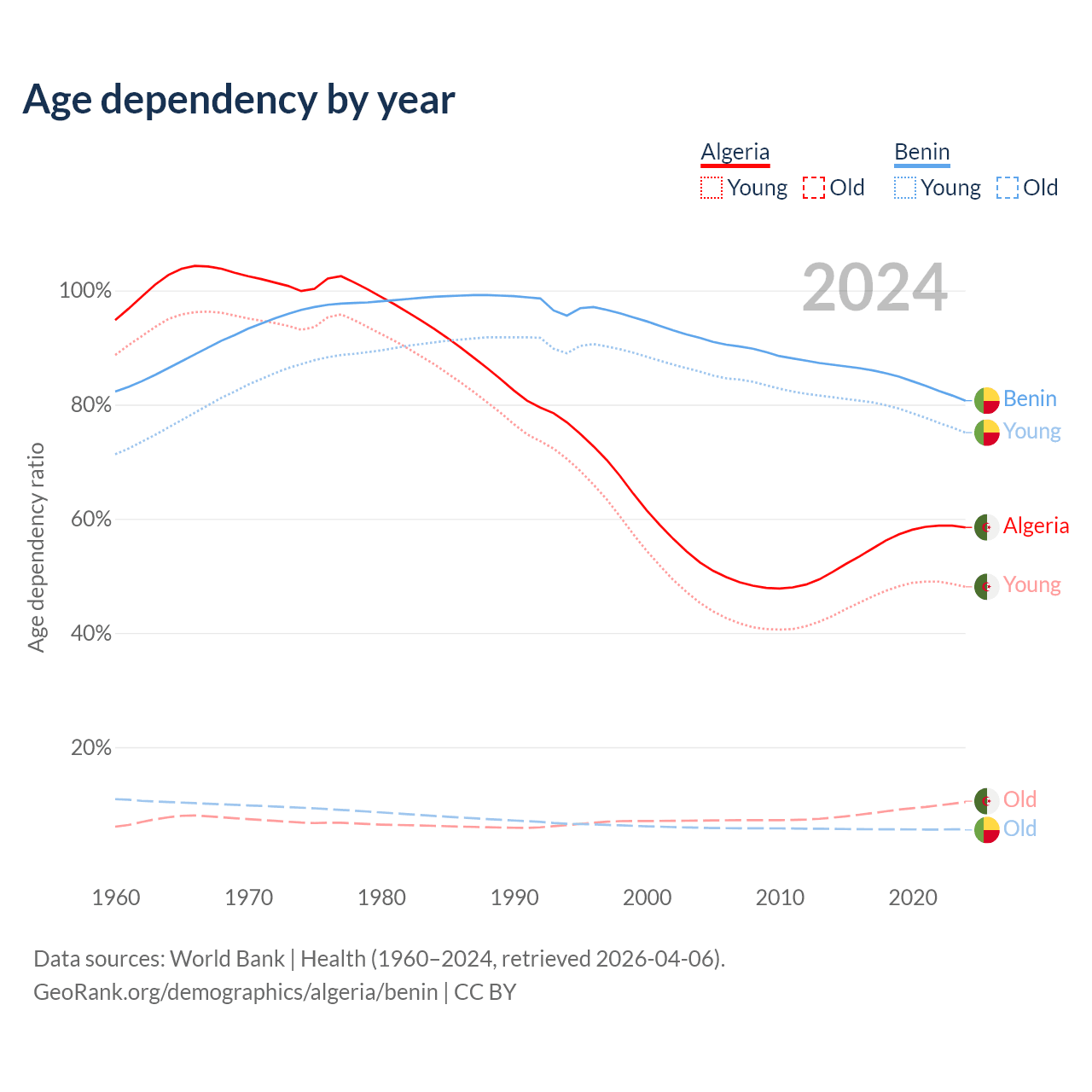 - Algeria is ranked 111/196 by median age (oldest to youngest) vs 179/196 for Benin.