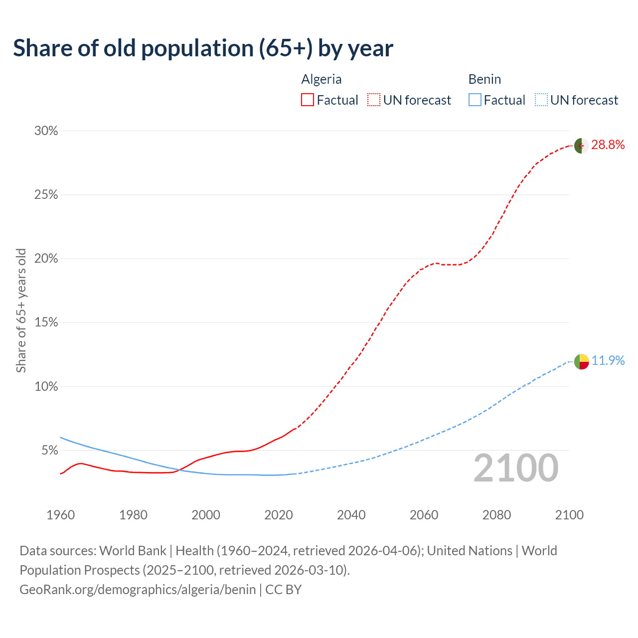 The share of older people aged 65 and over is 6.58% in Algeria and 3.12% in Benin. Life expectancy in Algeria compared to Benin .