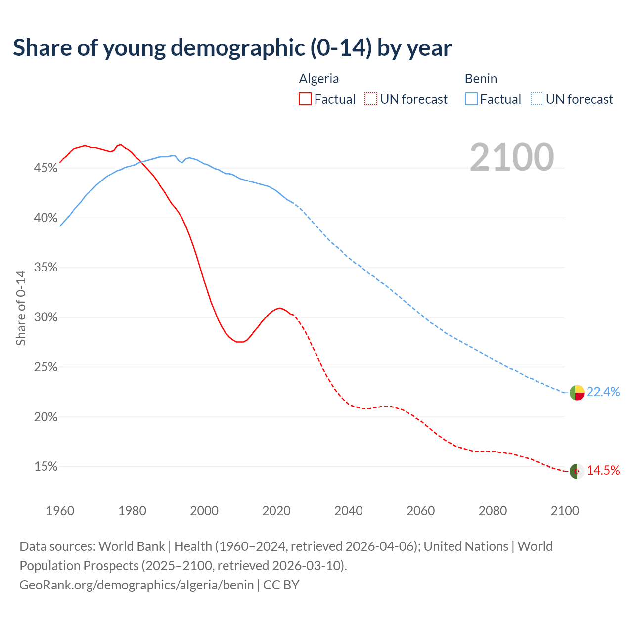 Median age Algeria vs Benin, 1960-2100