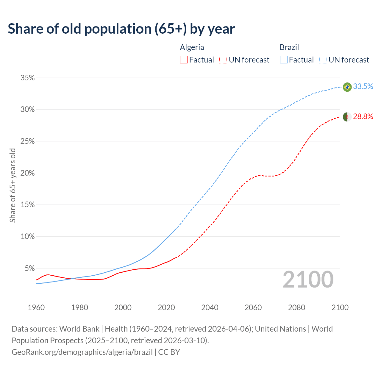 The share of older people aged 65 and over is 6.58% in Algeria and 11% in Brazil. Life expectancy in Algeria compared to Brazil .