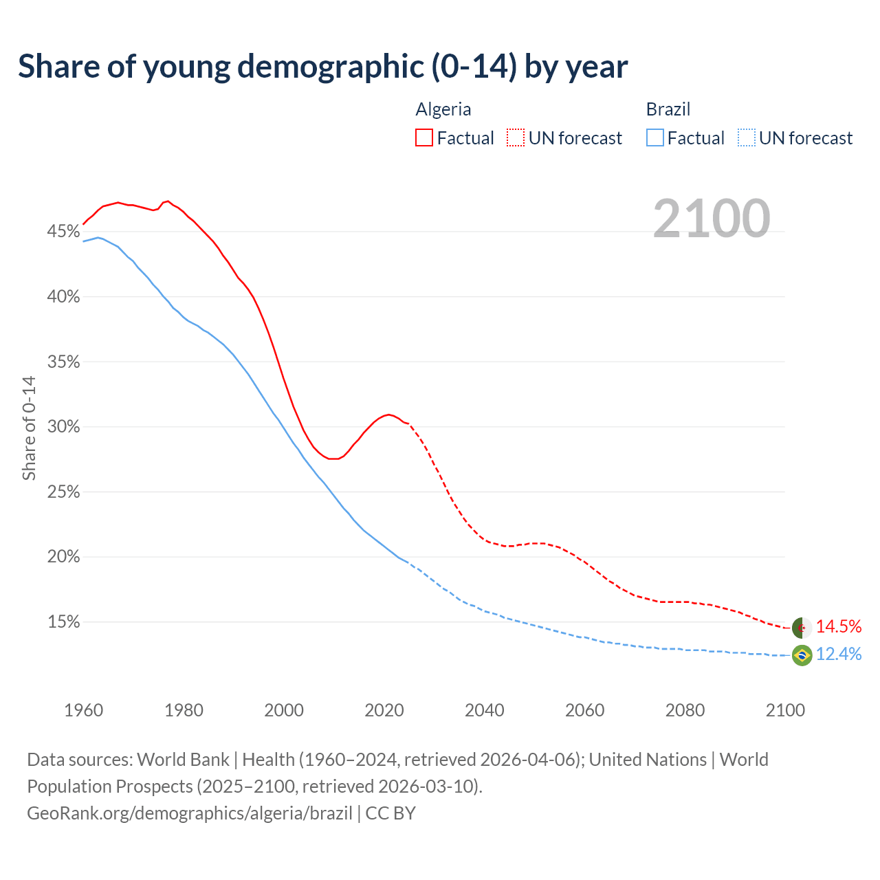 - The share of young demographic (0-15 years old) in Algeria is 30.3% vs 19.7% in Brazil.