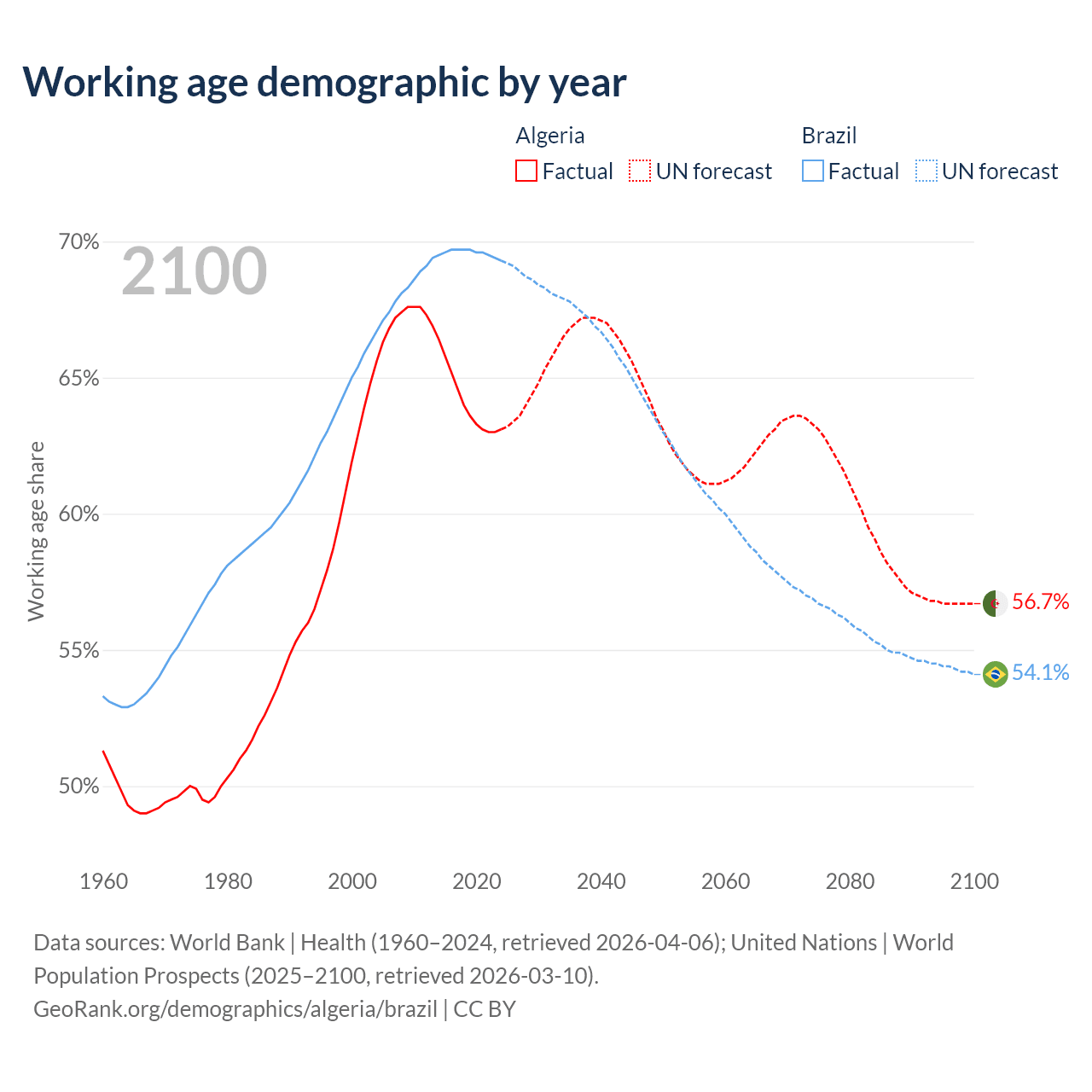 - Algeria has 30.4M working age adults (aged 15-64) vs 148M in Brazil.