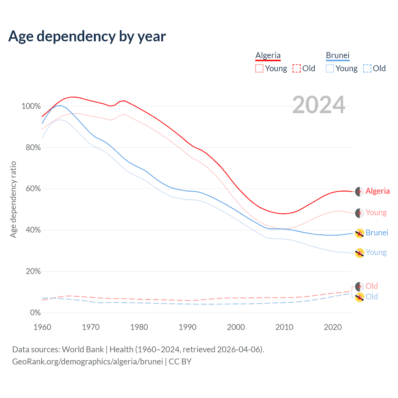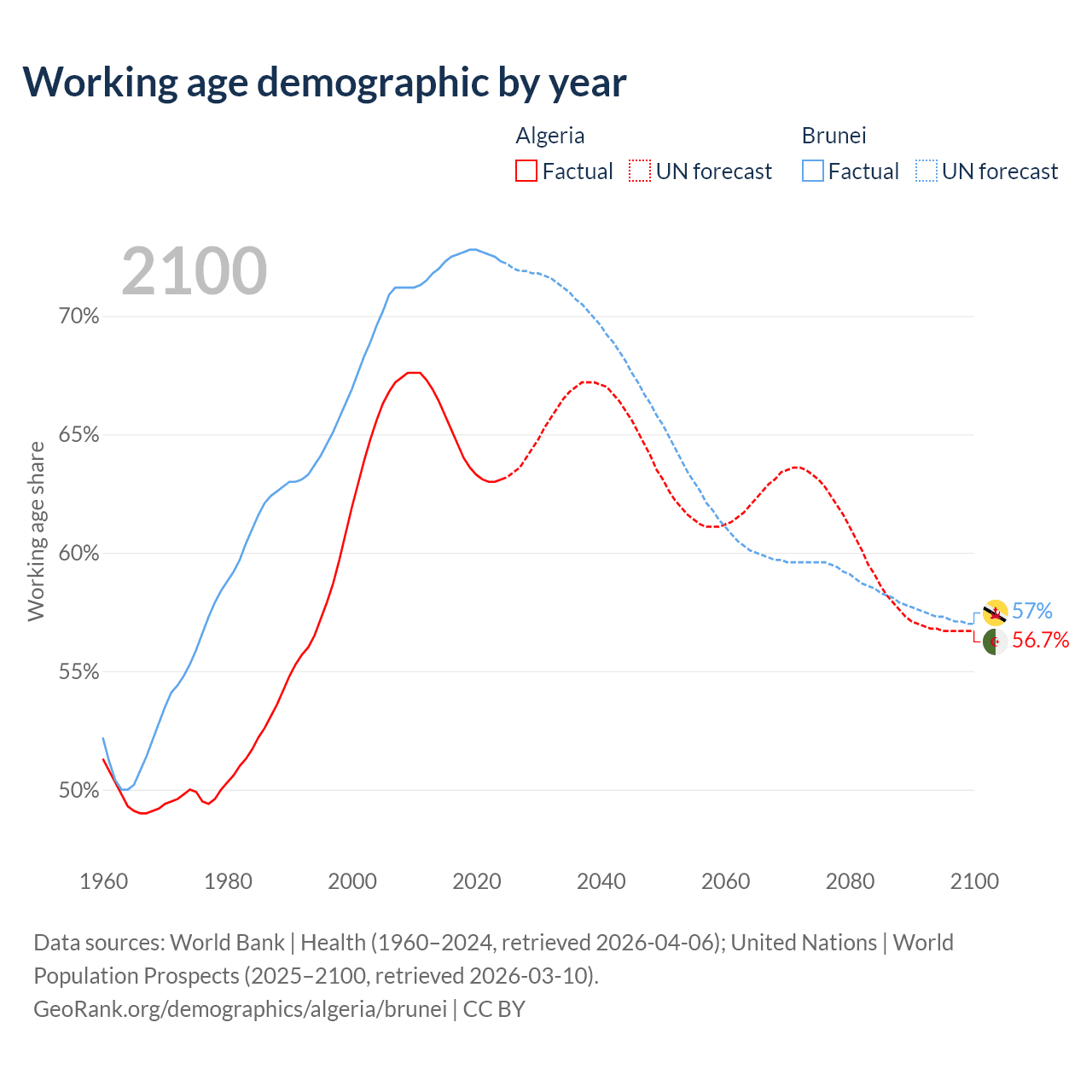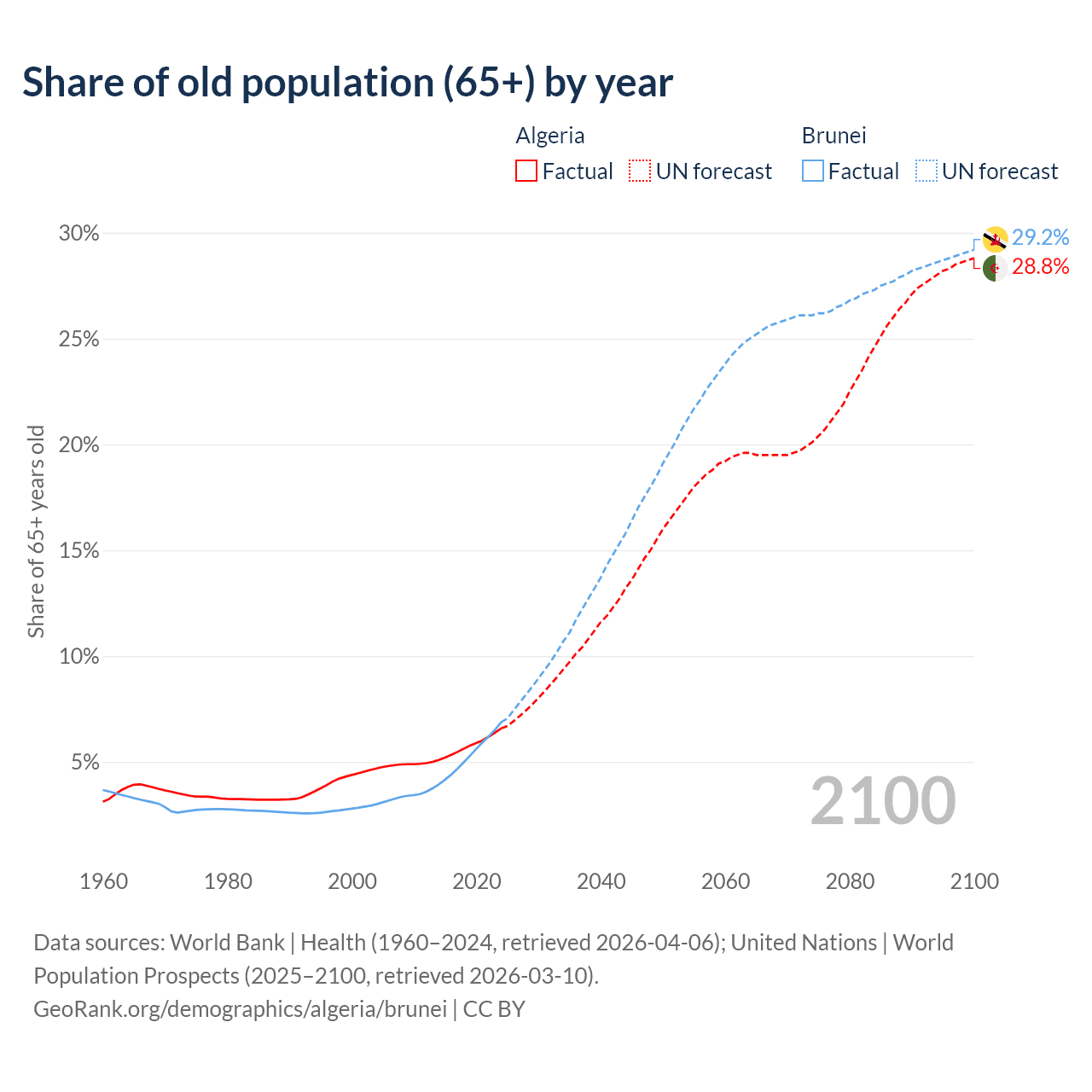 - The share of old-age demographic (65+) in Algeria is 6.58% vs 6.87% in Brunei.