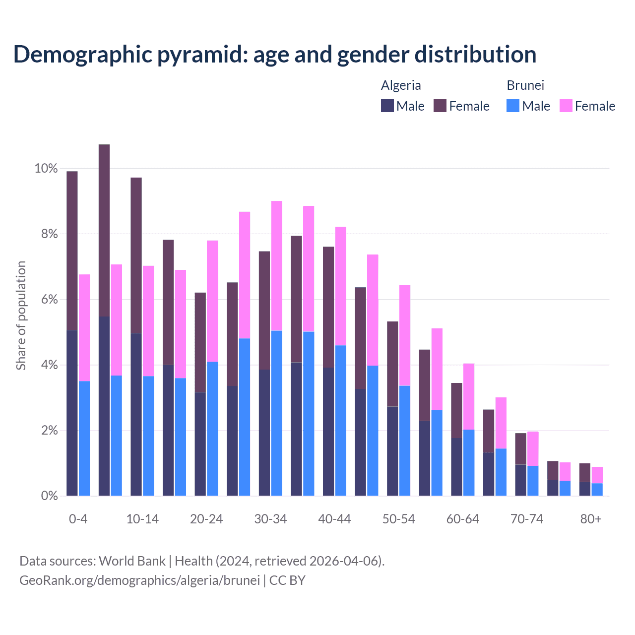 - Algeria is ranked 111/196 by median age (oldest to youngest) vs 88/196 for Brunei.