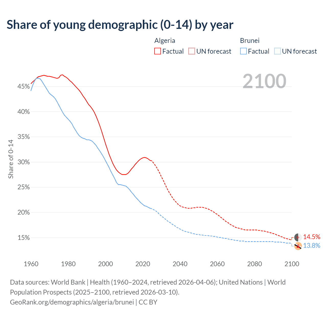 - The share of young demographic (0-15 years old) in Algeria is 30.3% vs 20.8% in Brunei.
