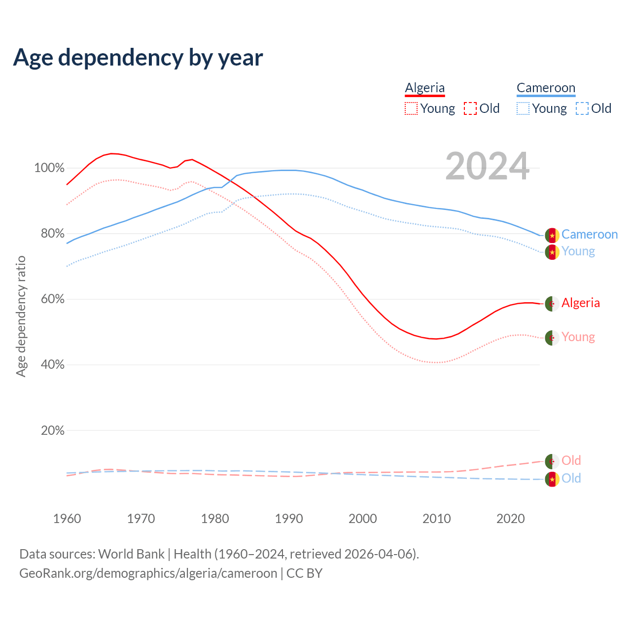 - The share of old-age demographic (65+) in Algeria is 6.58% vs 2.79% in Cameroon.
