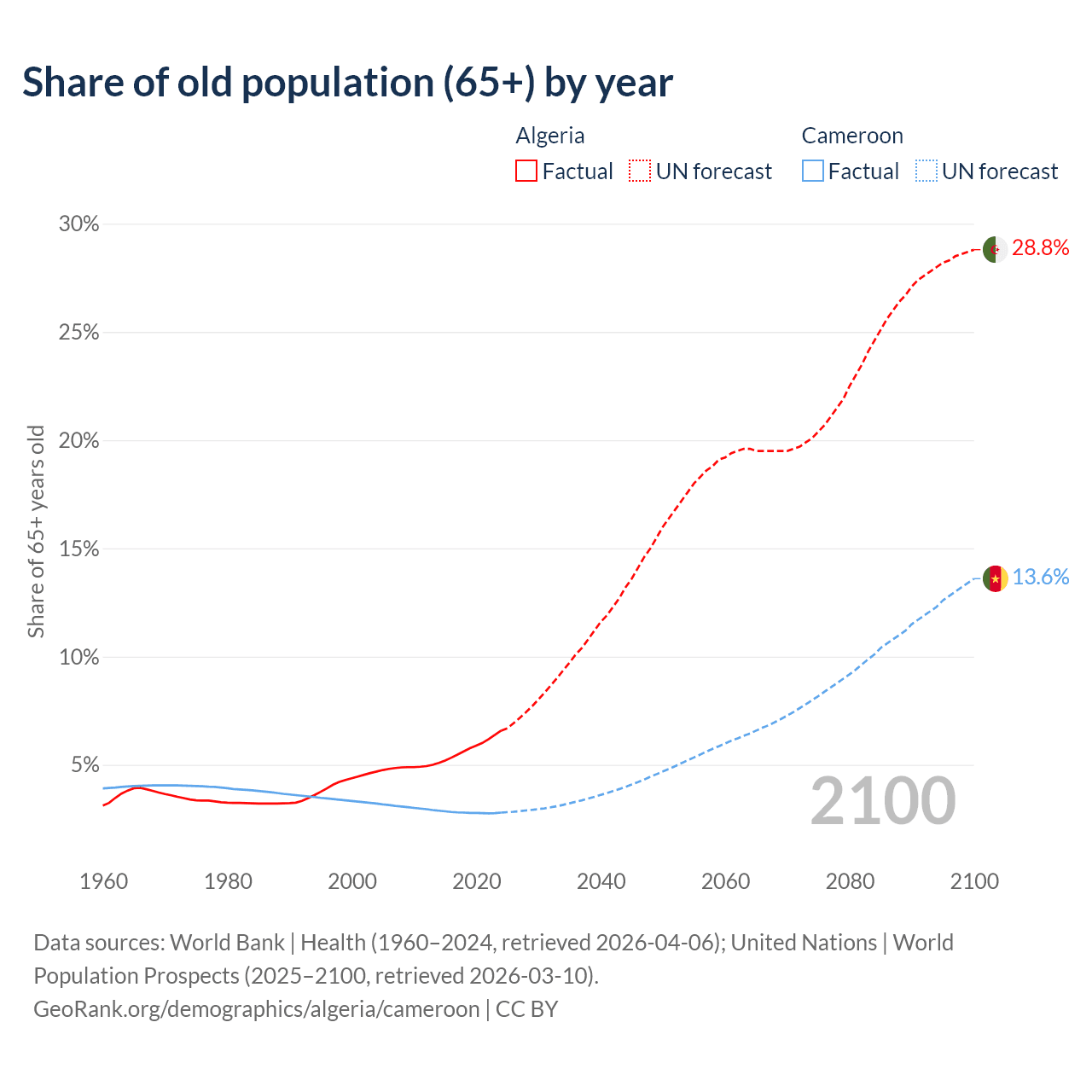 The share of older people aged 65 and over is 6.58% in Algeria and 2.79% in Cameroon. Life expectancy in Algeria compared to Cameroon .