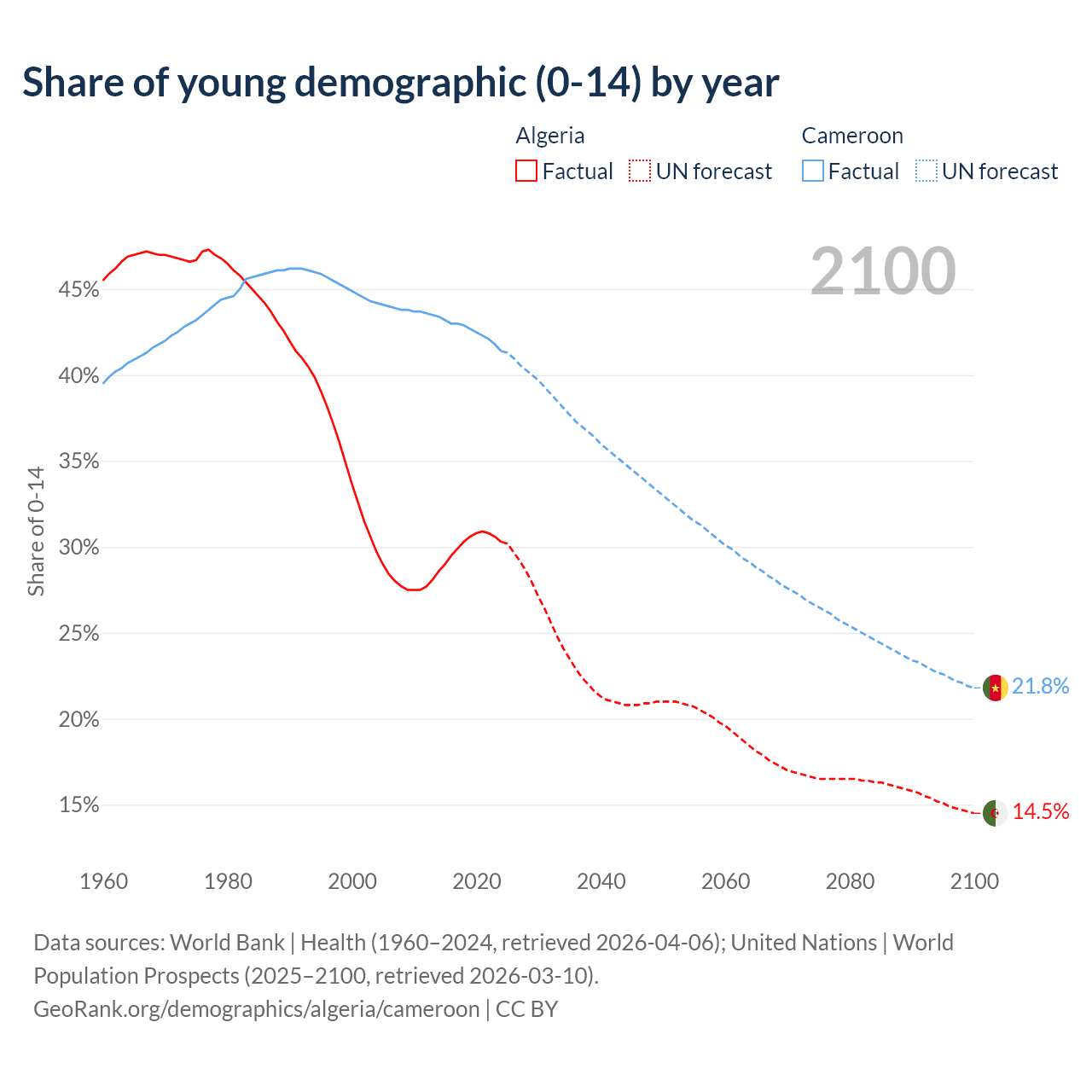 Median age Algeria vs Cameroon, 1960-2100