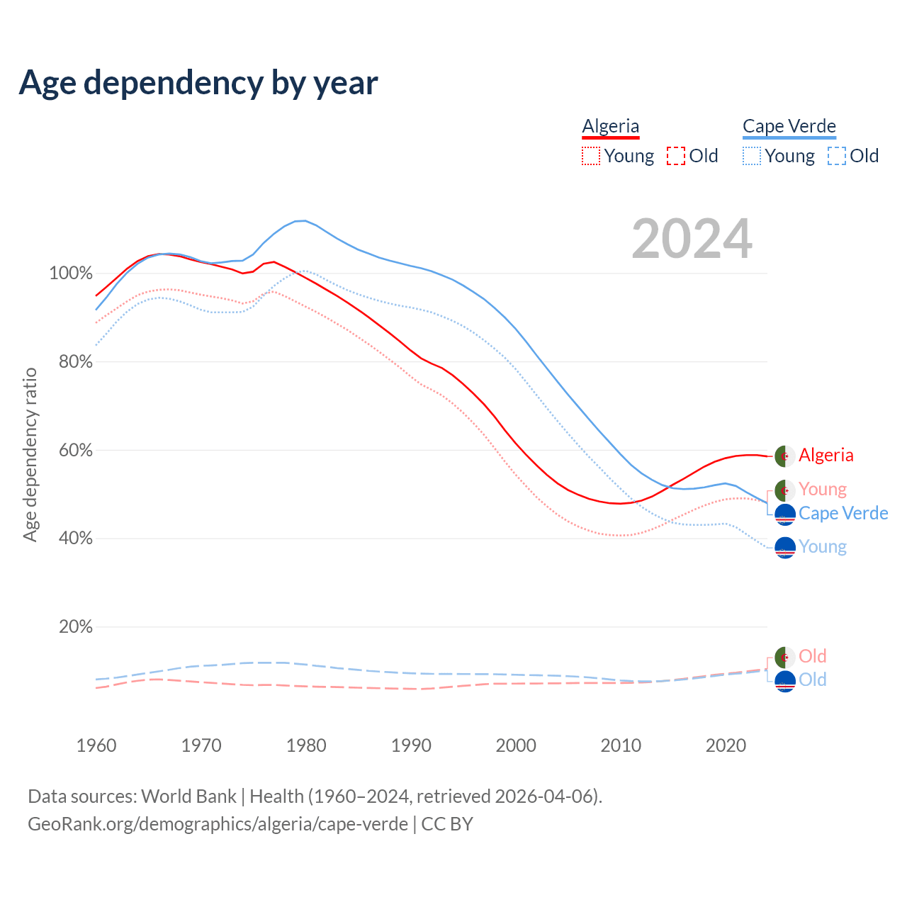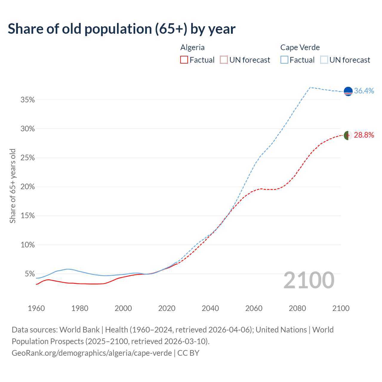 - The share of old-age demographic (65+) in Algeria is 6.58% vs 6.86% in Cape Verde.