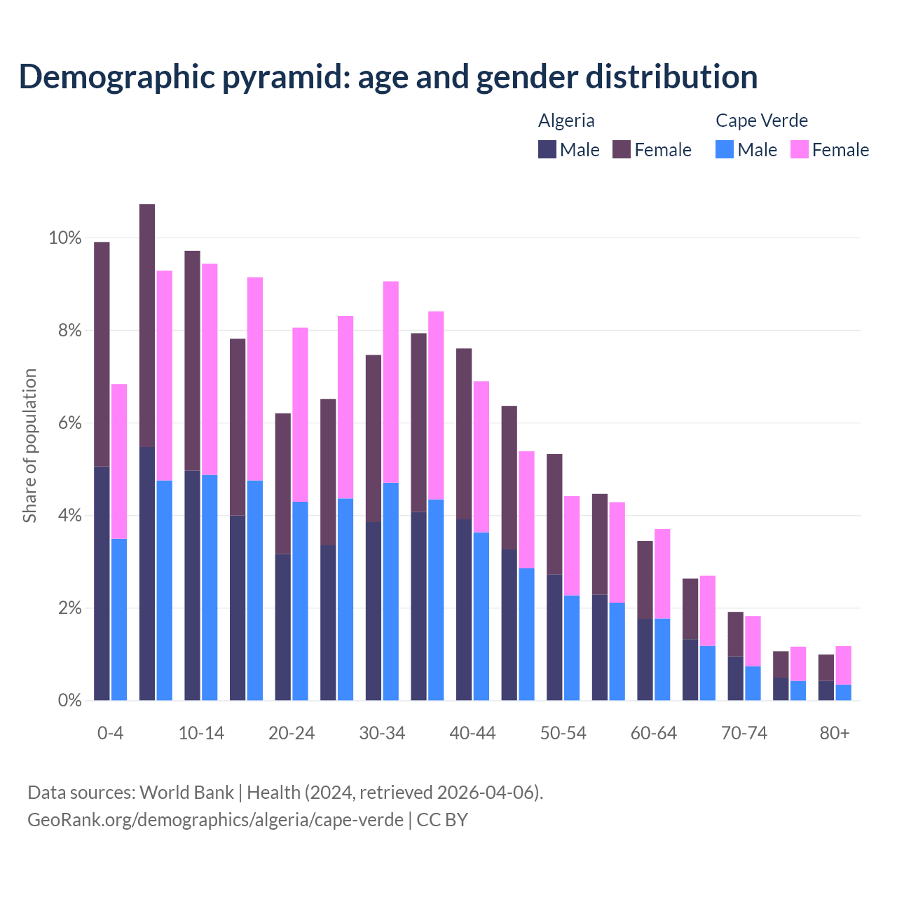 - Algeria is ranked 111/196 by median age (oldest to youngest) vs 110/196 for Cape Verde.