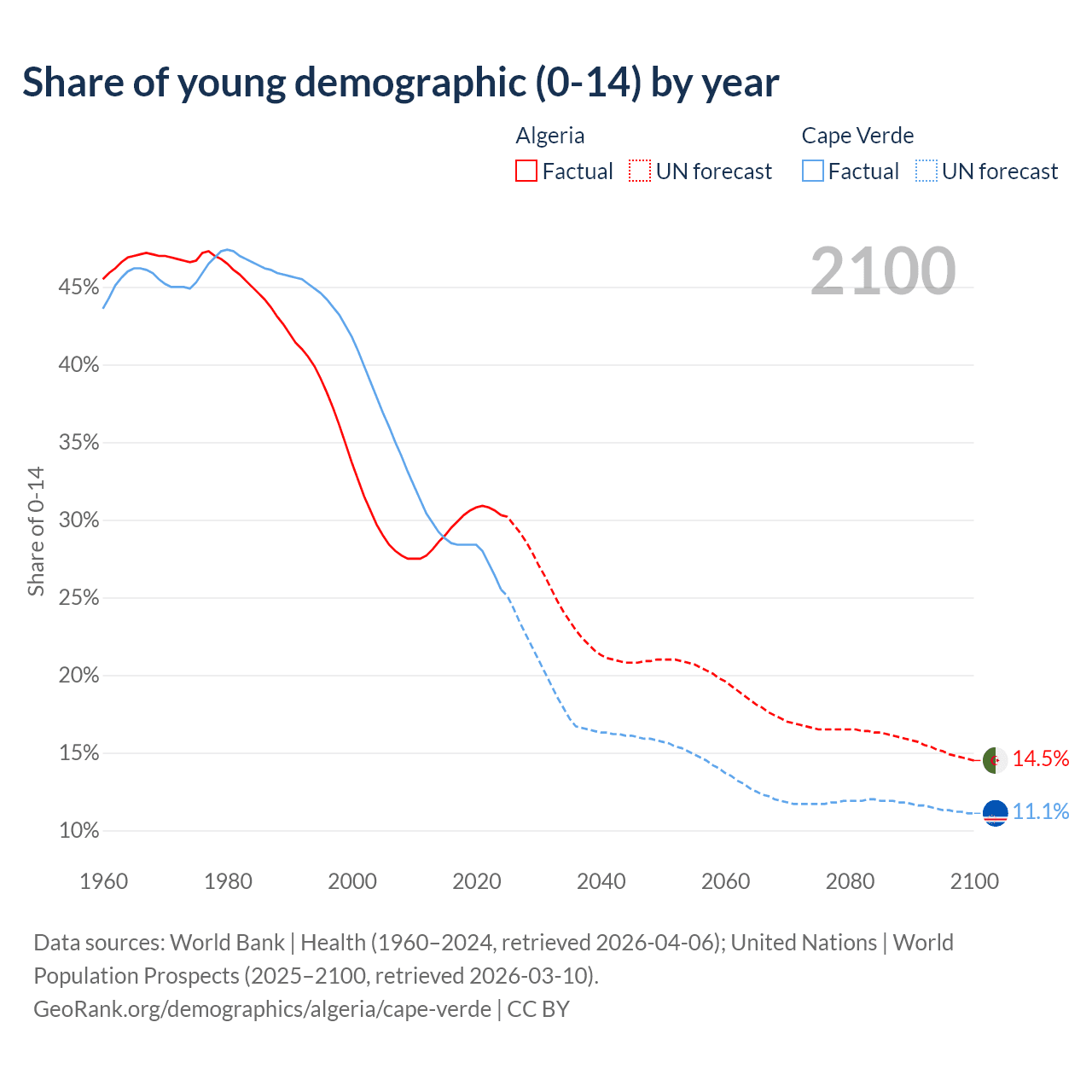 - The share of young demographic (0-15 years old) in Algeria is 30.3% vs 25.5% in Cape Verde.