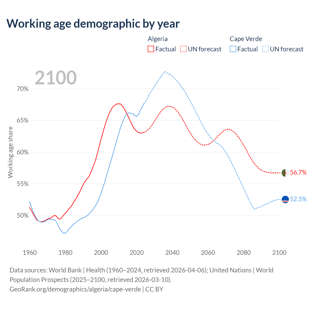 - Algeria has 30.4M working age adults (aged 15-64) vs 359K in Cape Verde.