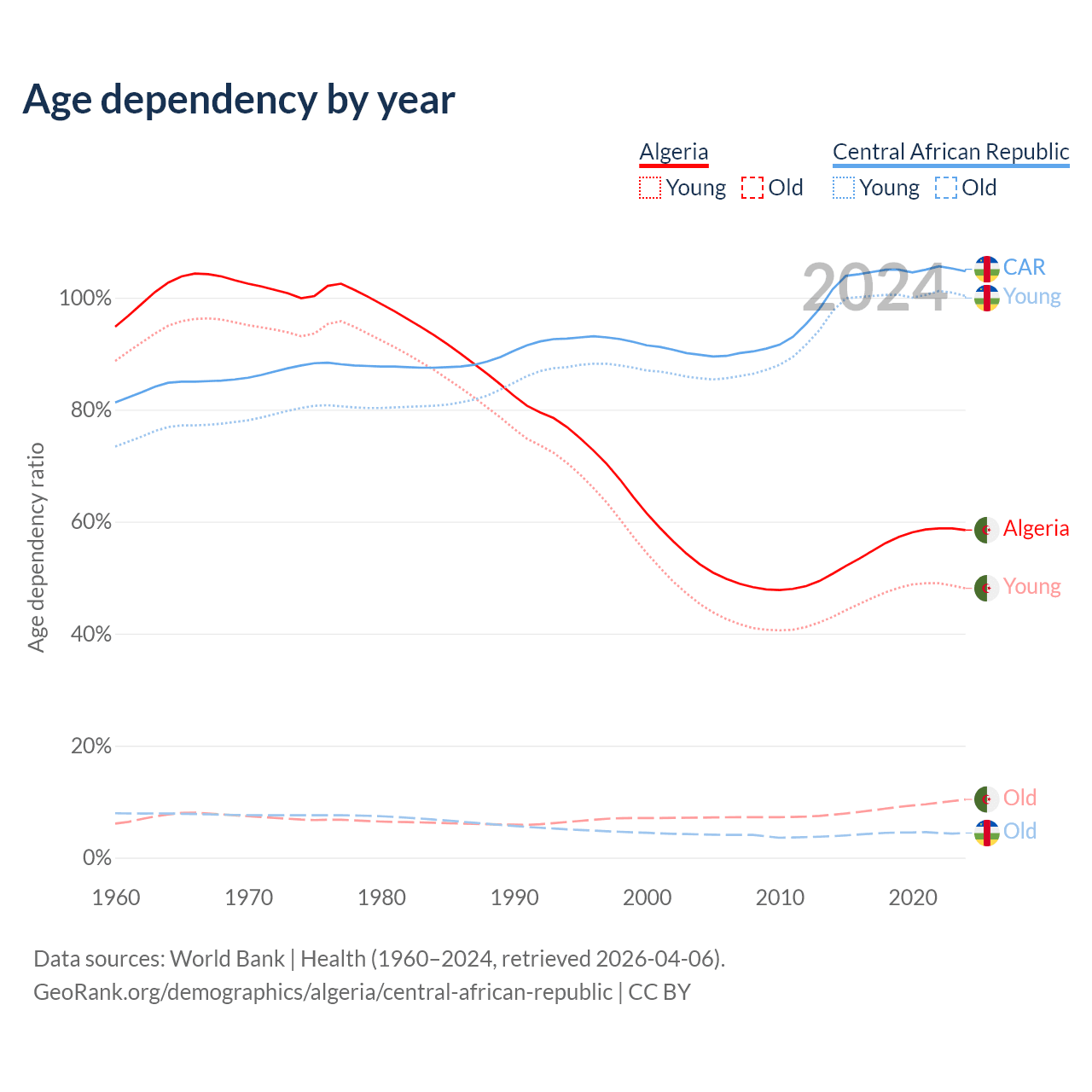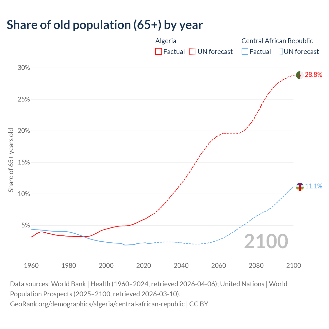 - The share of old-age demographic (65+) in Algeria is 6.58% vs 2.15% in the Central African Republic.