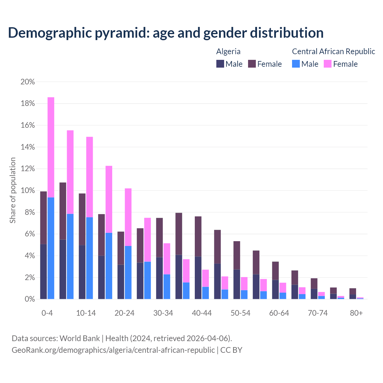 The share of older people aged 65 and over is 6.58% in Algeria and 2.15% in the Central African Republic. Life expectancy in Algeria compared to the Central African Republic .