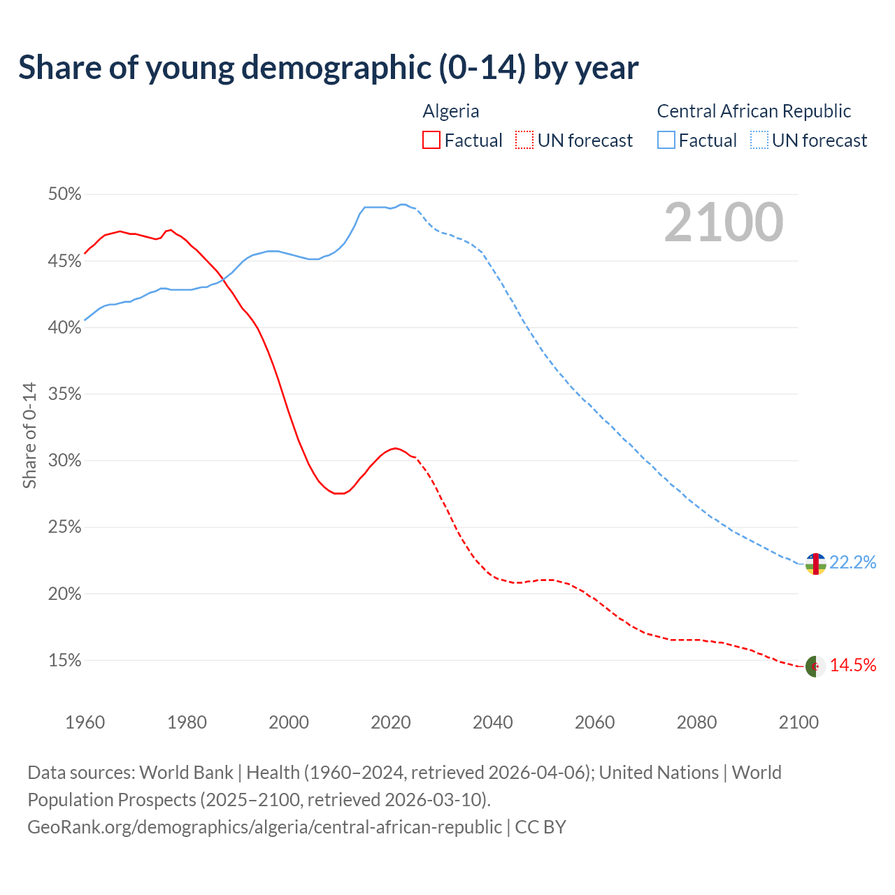 - The share of young demographic (0-15 years old) in Algeria is 30.3% vs 49% in the Central African Republic.