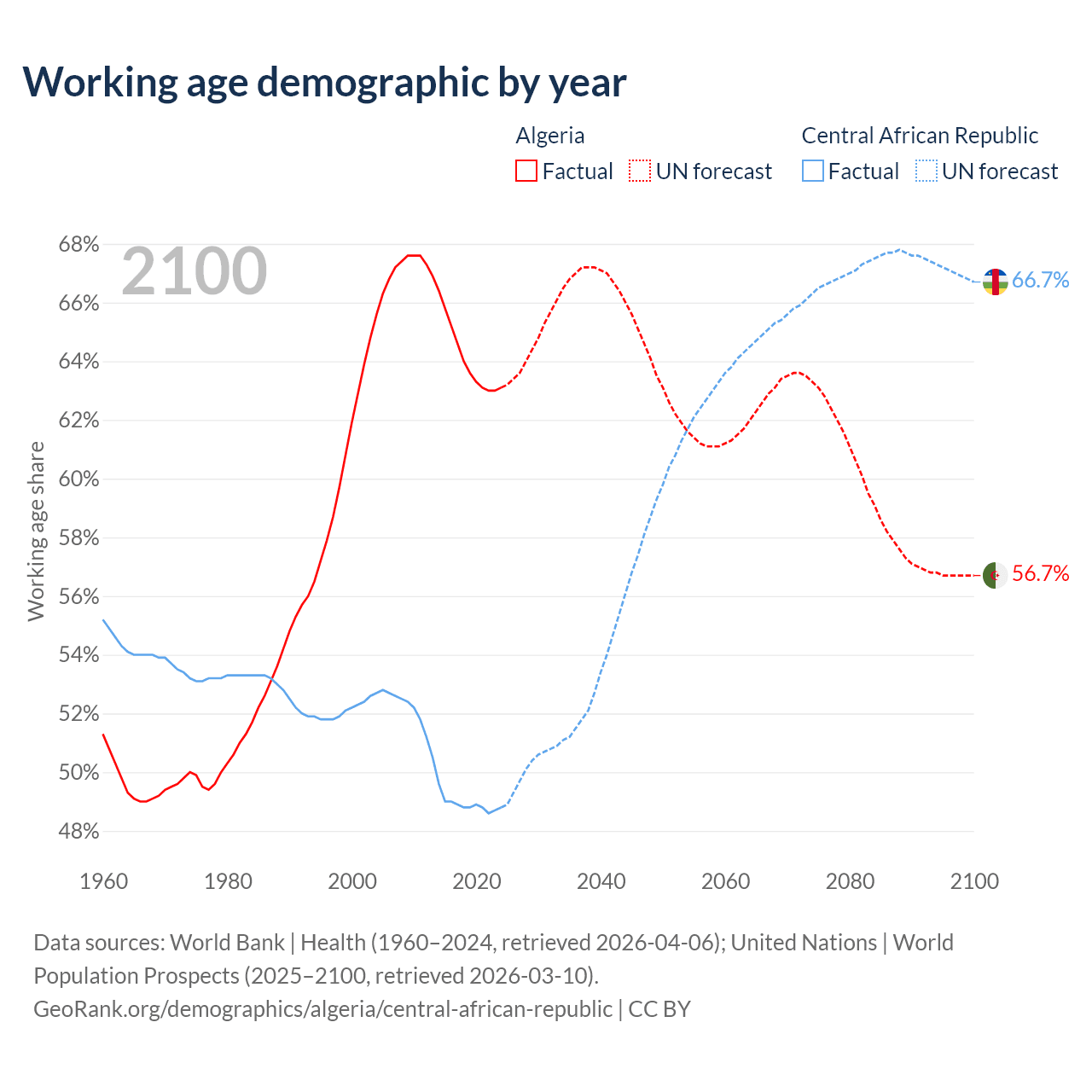 - Algeria has 30.4M working age adults (aged 15-64) vs 2.81M in the Central African Republic.