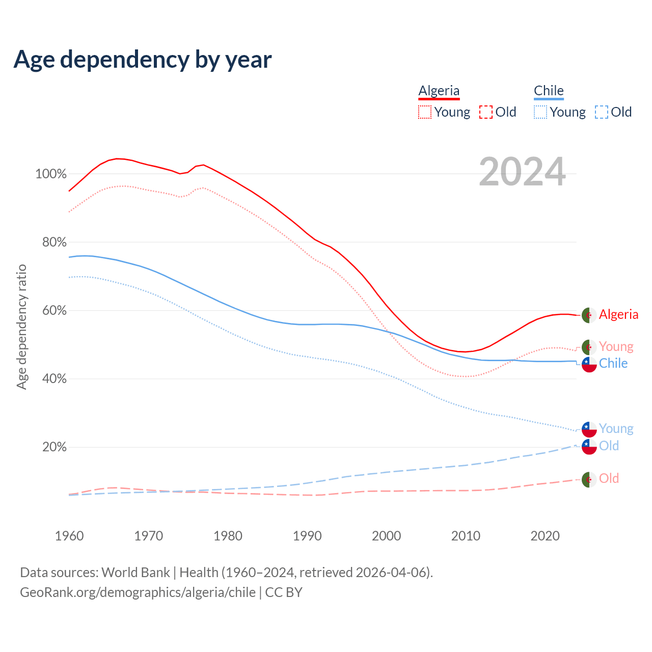 - The share of old-age demographic (65+) in Algeria is 6.58% vs 14.1% in Chile.