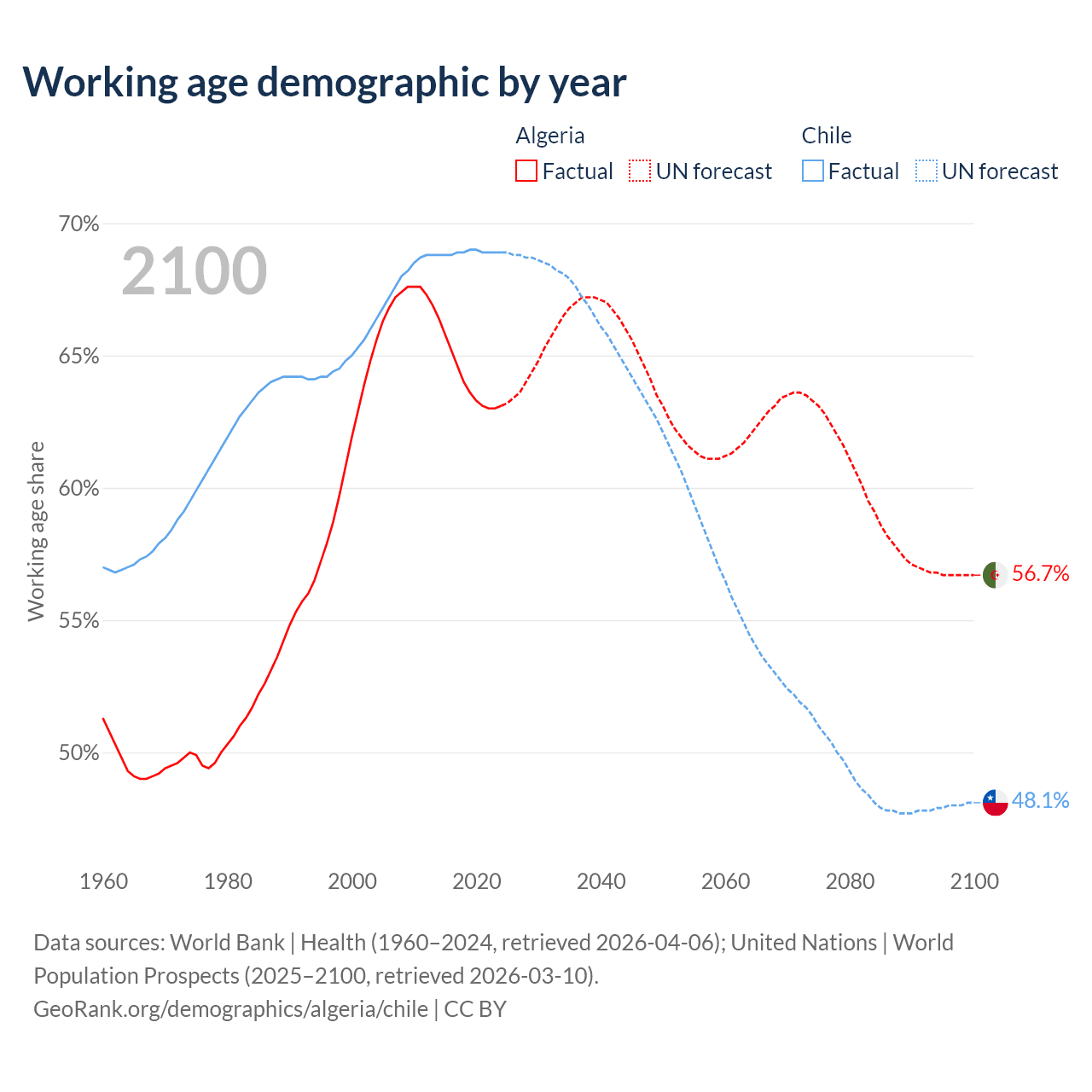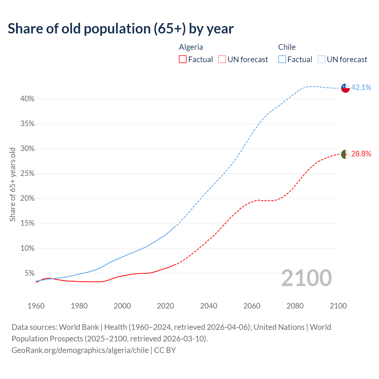 Median age Algeria vs Chile, 1960-2100