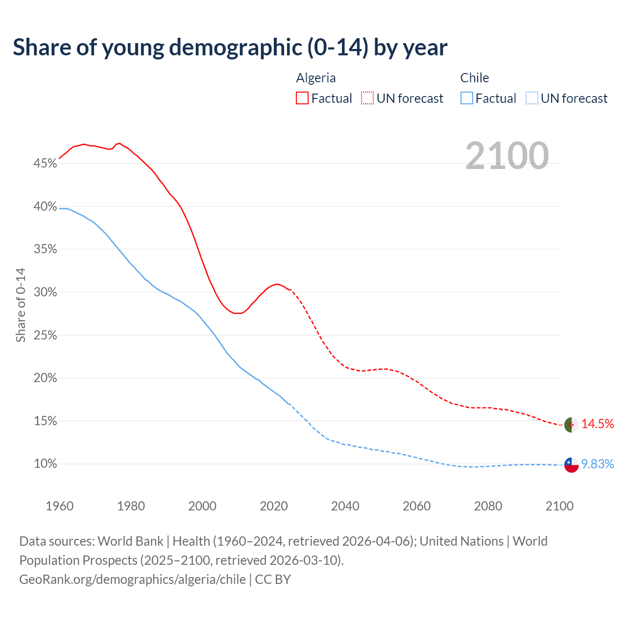- The share of young demographic (0-15 years old) in Algeria is 30.3% vs 17% in Chile.