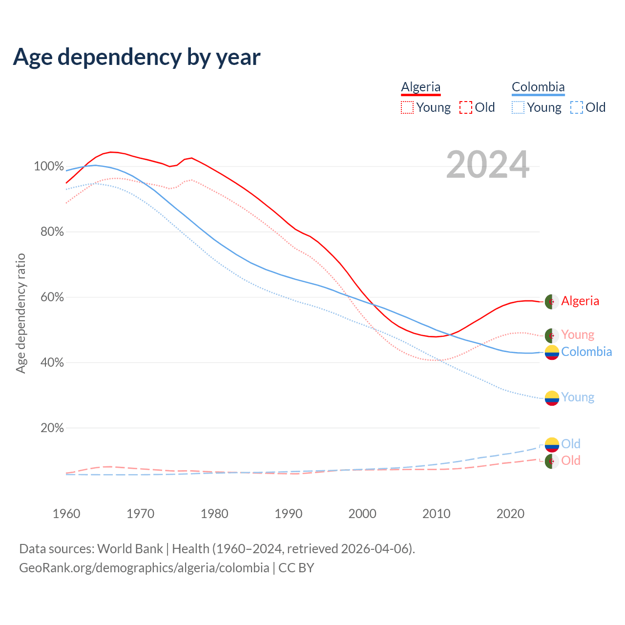 - Algeria is ranked 111/196 by median age (oldest to youngest) vs 89/196 for Colombia.