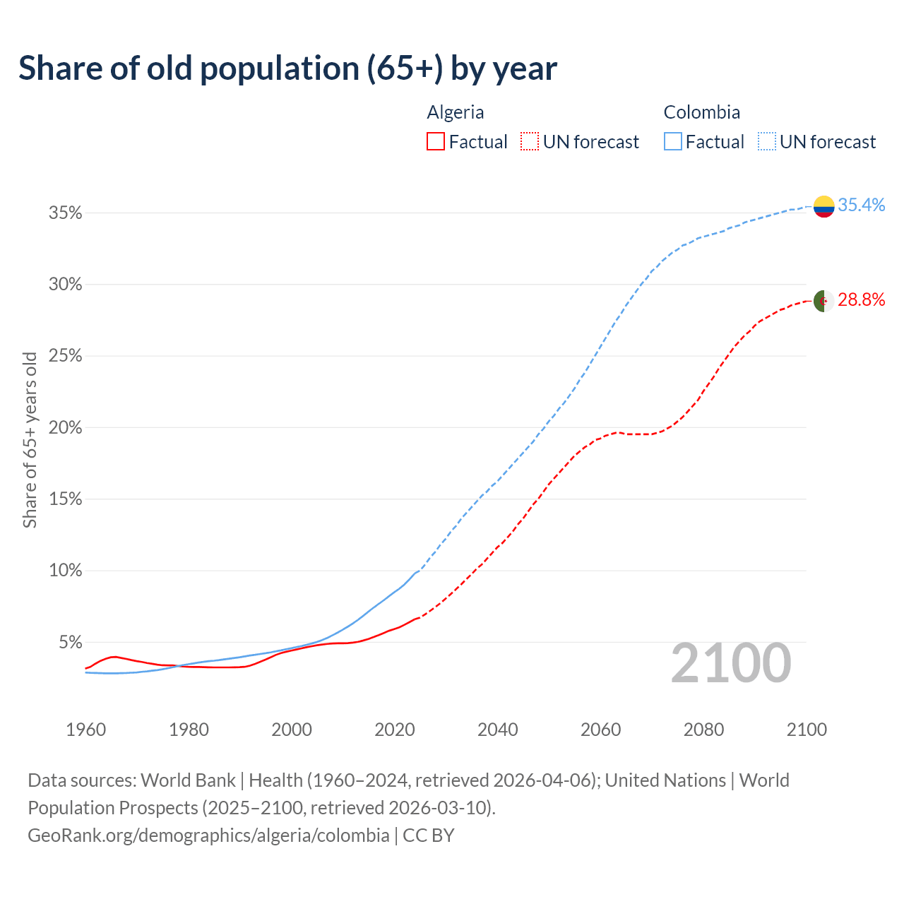 The share of older people aged 65 and over is 6.58% in Algeria and 9.78% in Colombia. Life expectancy in Algeria compared to Colombia .