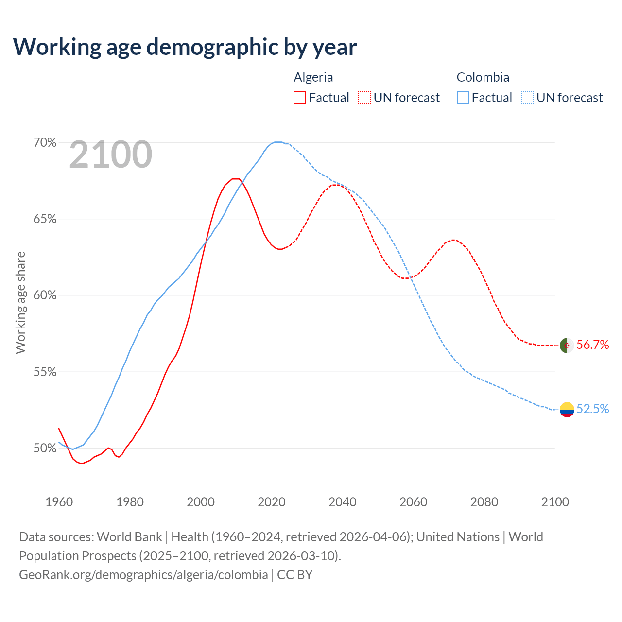 - Algeria has 30.4M working age adults (aged 15-64) vs 37.8M in Colombia.