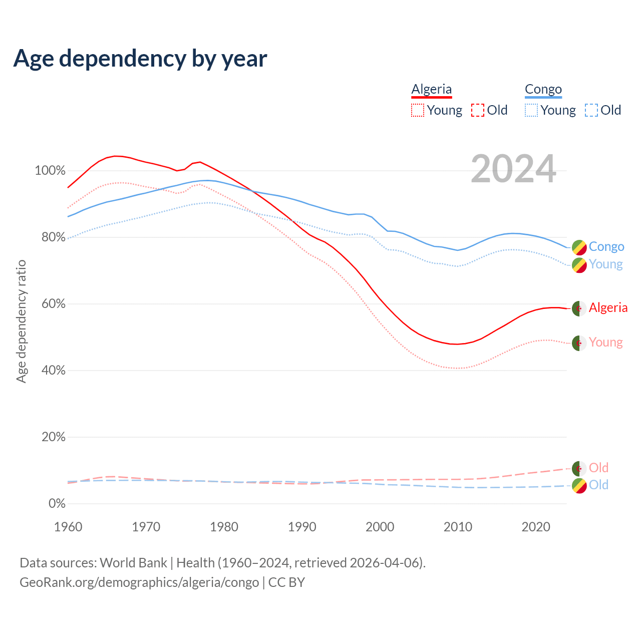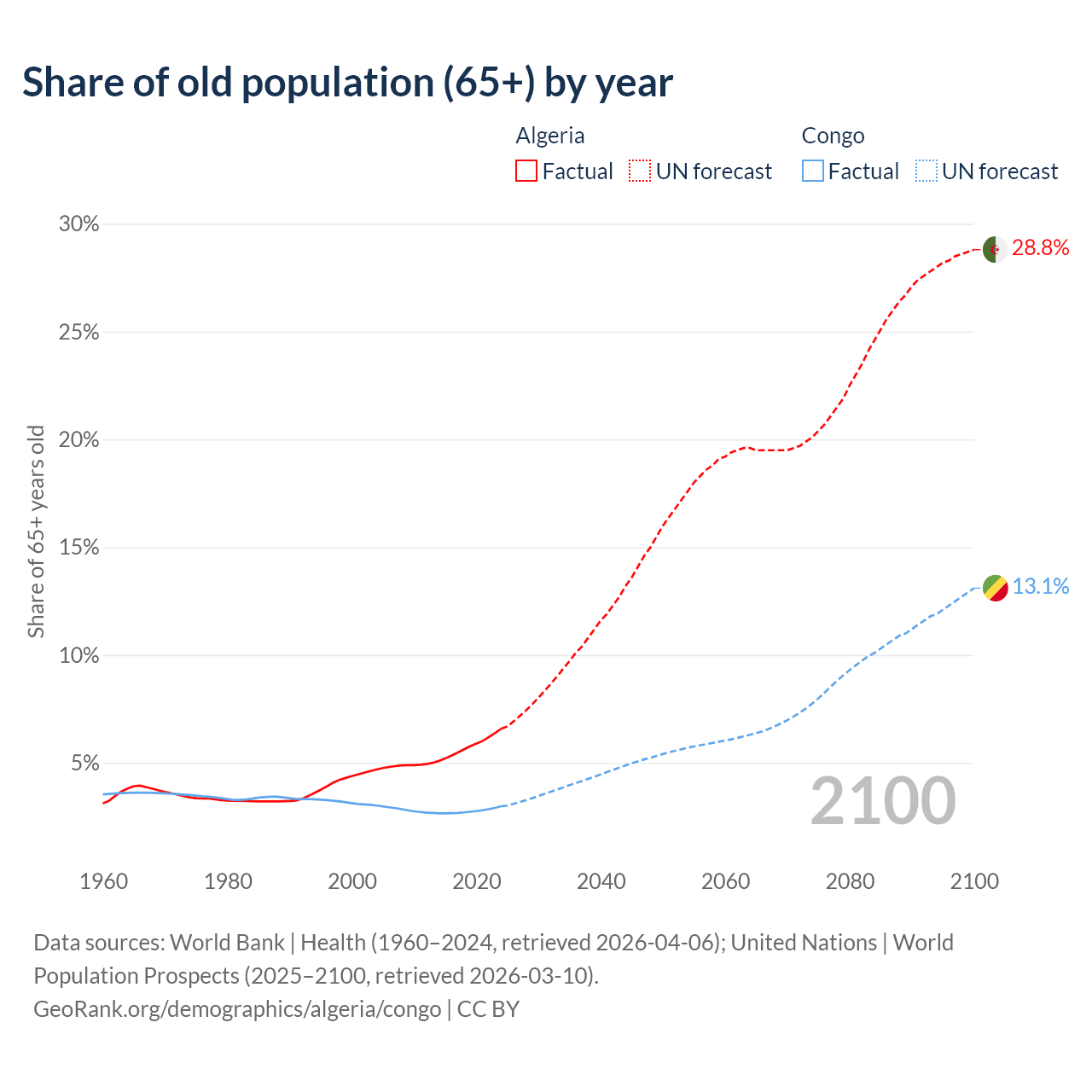 - The share of old-age demographic (65+) in Algeria is 6.58% vs 2.99% in the Congo.