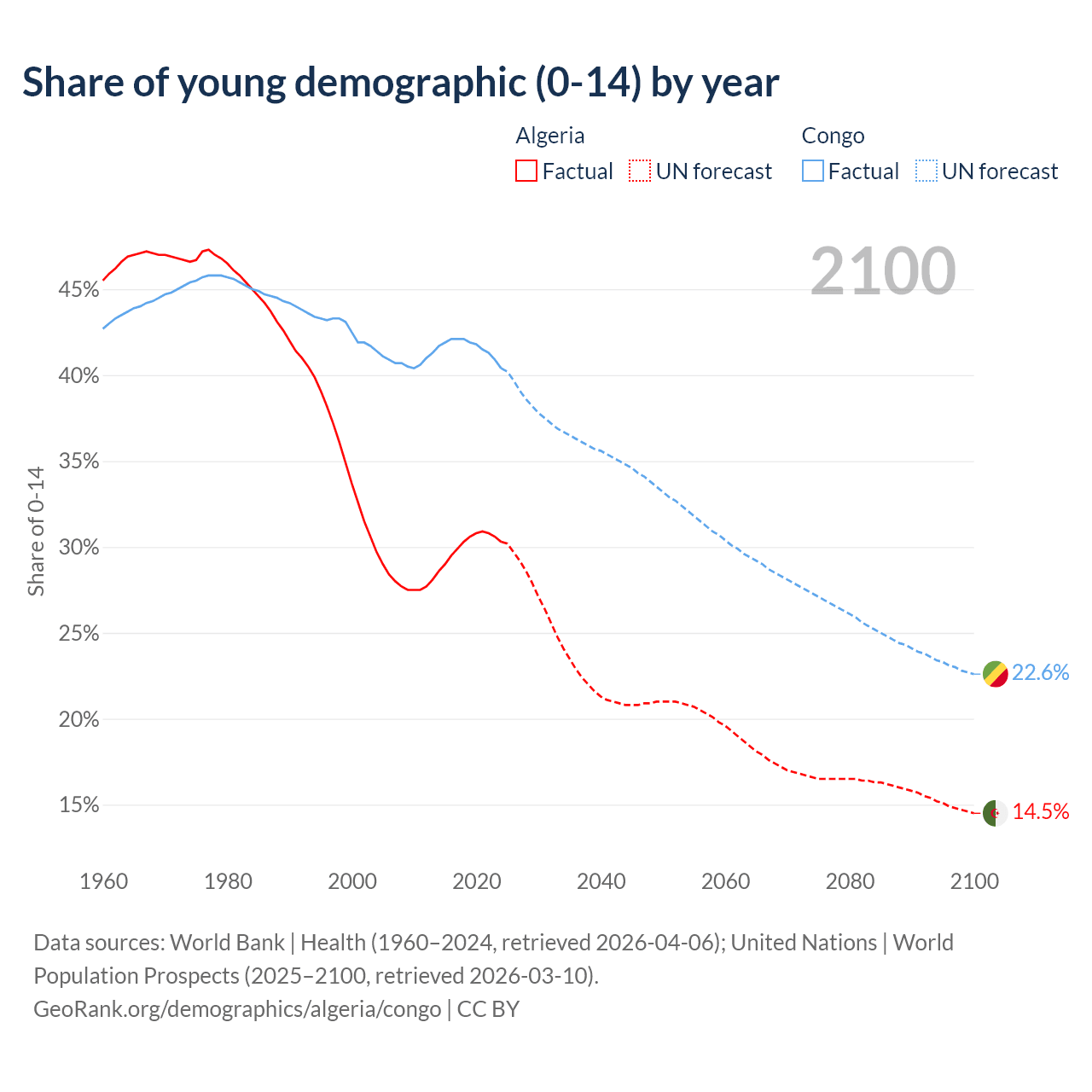Median age Algeria vs Congo, 1960-2100