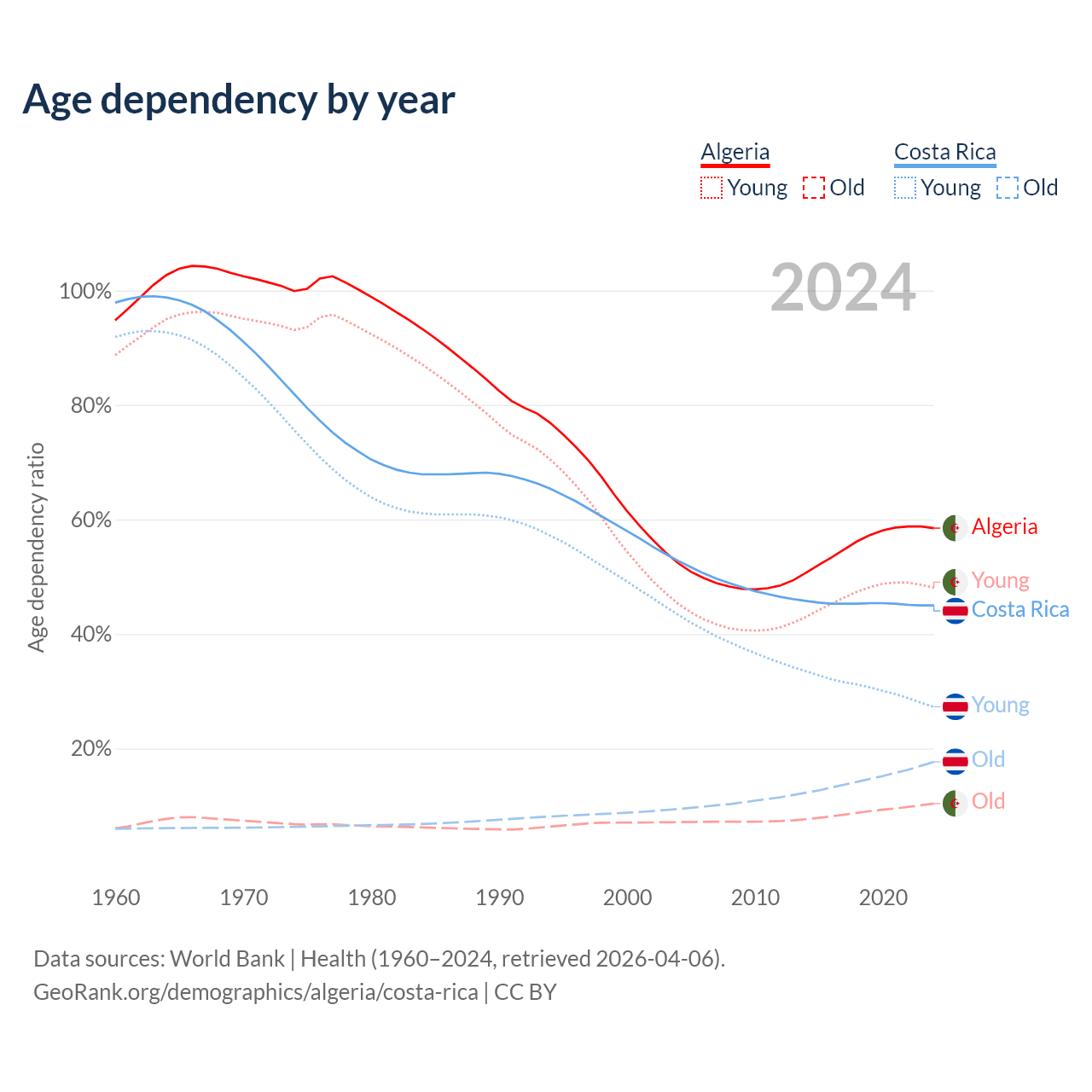 - Algeria is ranked 111/196 by median age (oldest to youngest) vs 72/196 for Costa Rica.