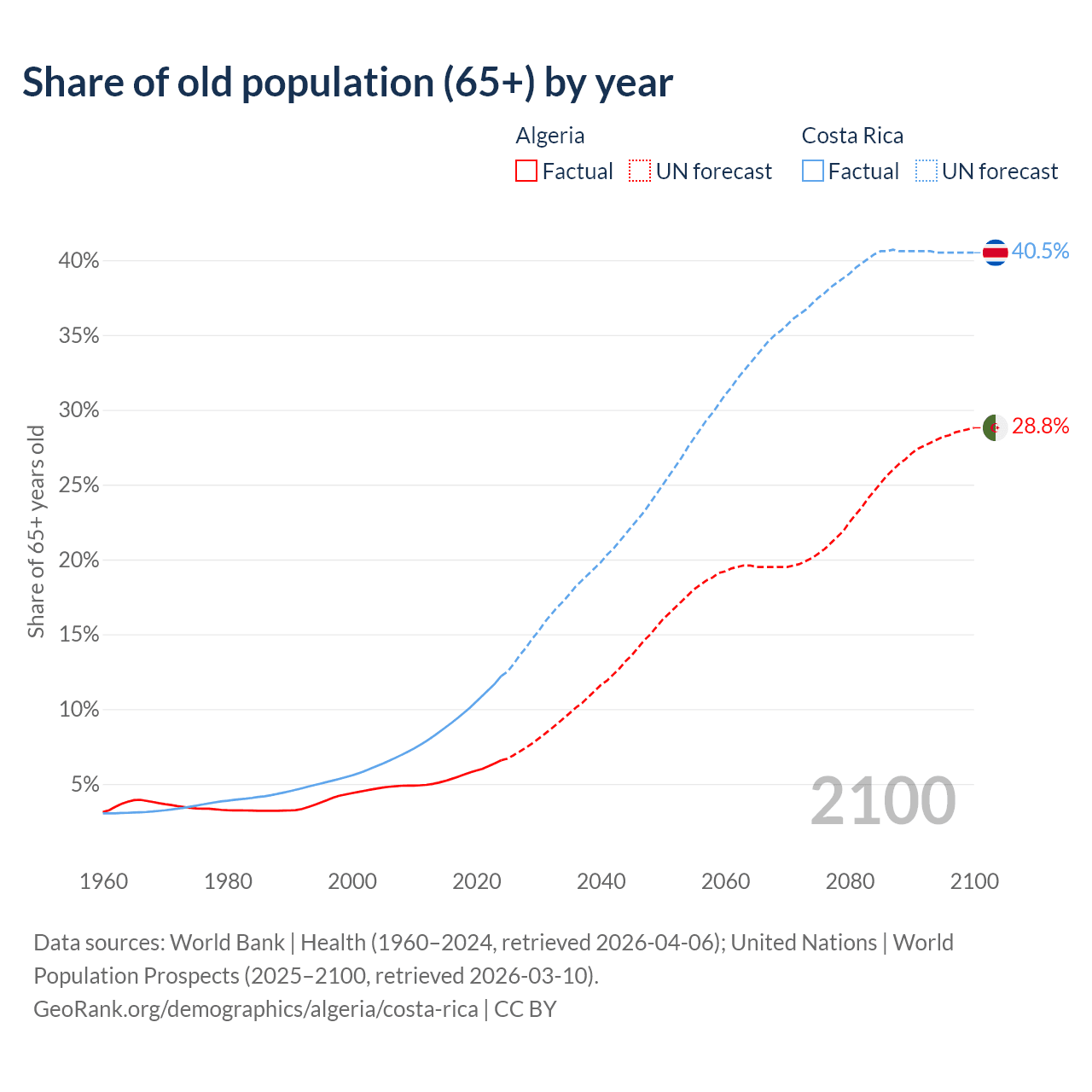 The share of older people aged 65 and over is 6.58% in Algeria and 12.2% in Costa Rica. Life expectancy in Algeria compared to Costa Rica .