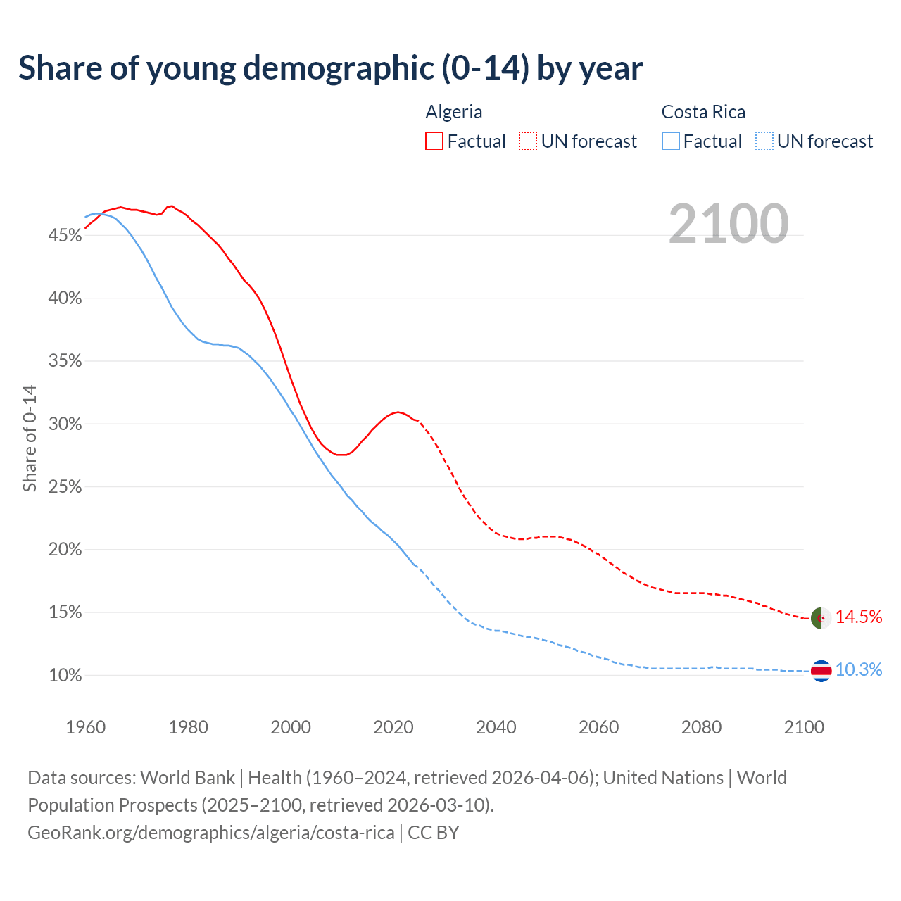 - The share of young demographic (0-15 years old) in Algeria is 30.3% vs 18.8% in Costa Rica.