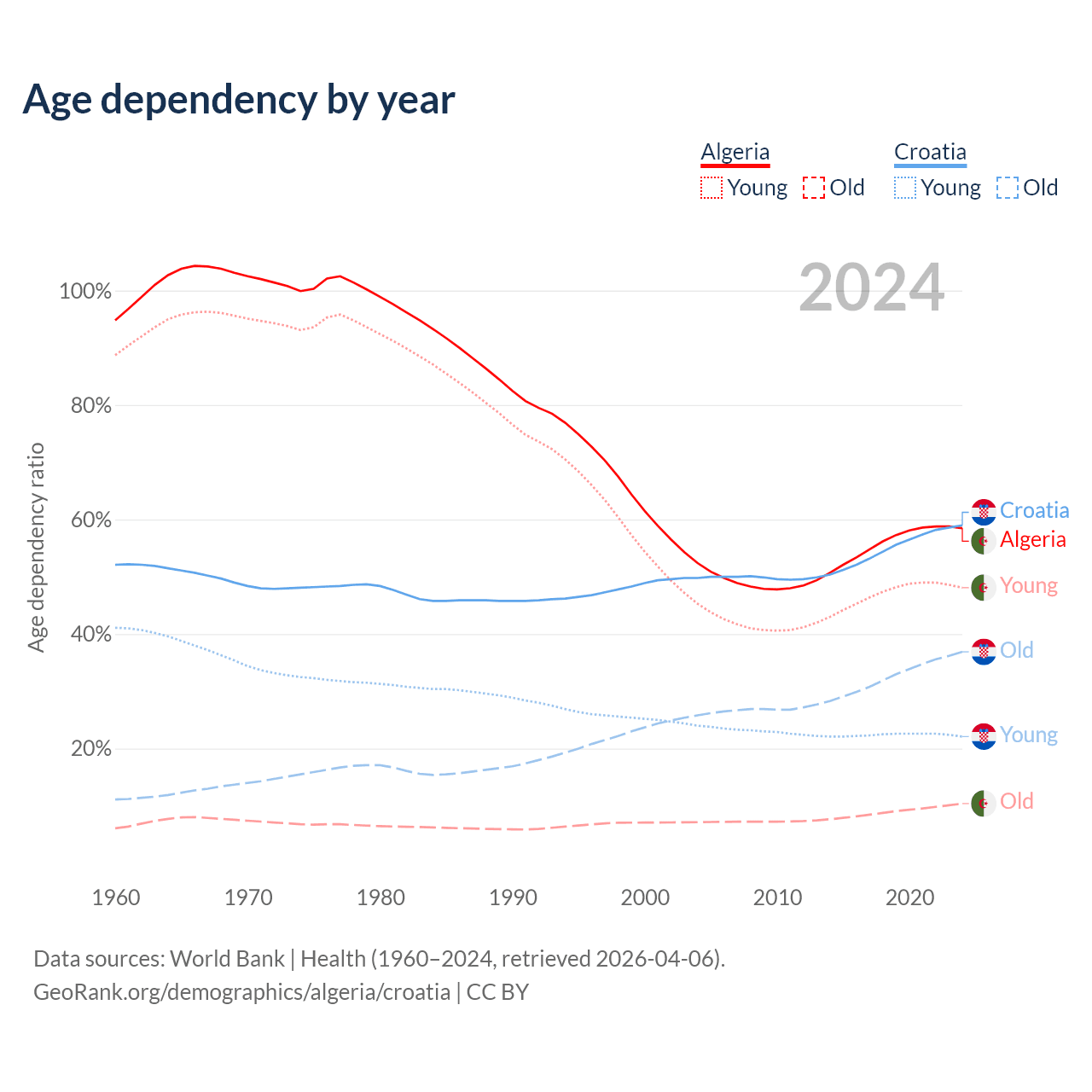 The share of older people aged 65 and over is 6.58% in Algeria and 23.2% in Croatia. Life expectancy in Algeria compared to Croatia .