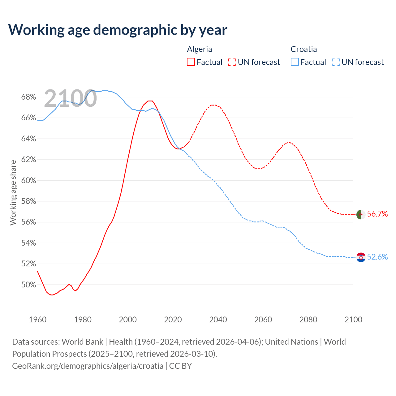 Median age Algeria vs Croatia, 1960-2100