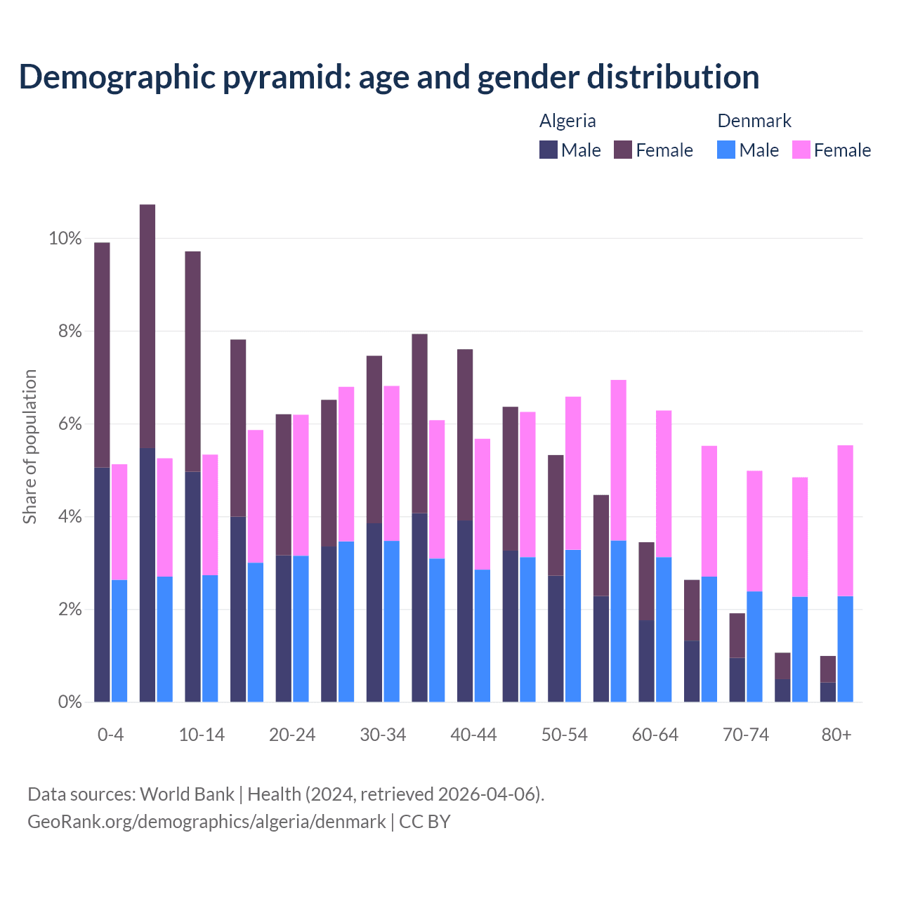 - Algeria is ranked 111/196 by median age (oldest to youngest) vs 34/196 for Denmark.