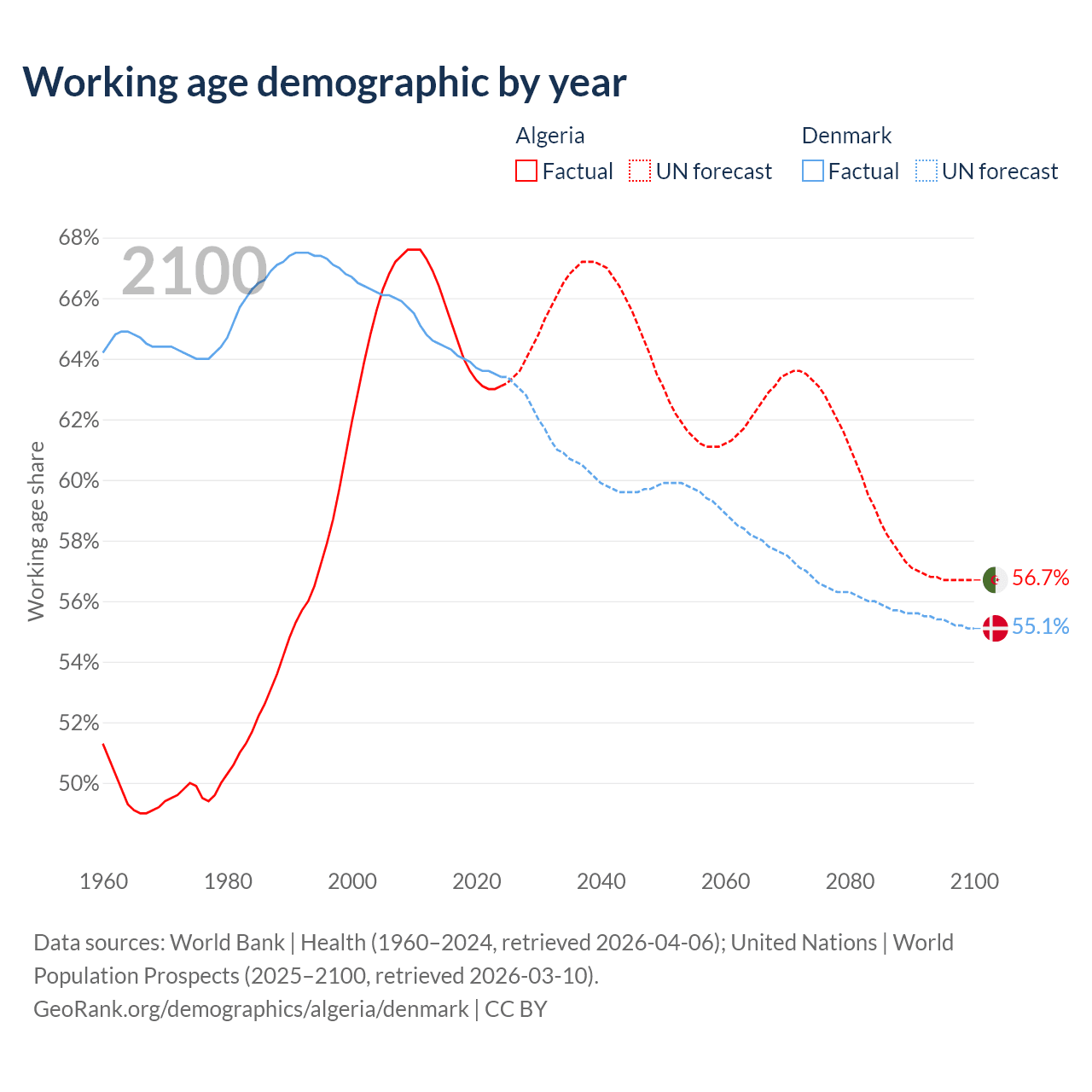 - Algeria has 30.4M working age adults (aged 15-64) vs 3.83M in Denmark.