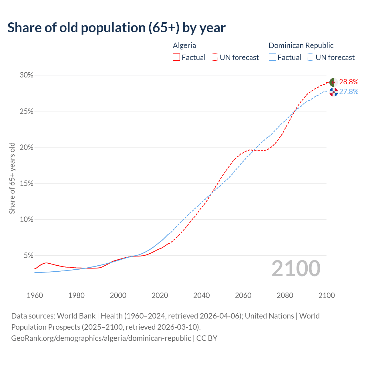 - The share of old-age demographic (65+) in Algeria is 6.58% vs 7.88% in the Dominican Republic.