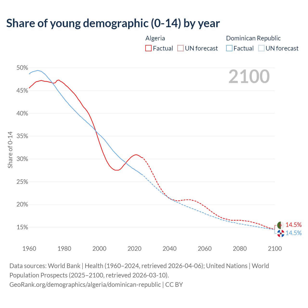 Median age Algeria vs Dominican Republic, 1960-2100