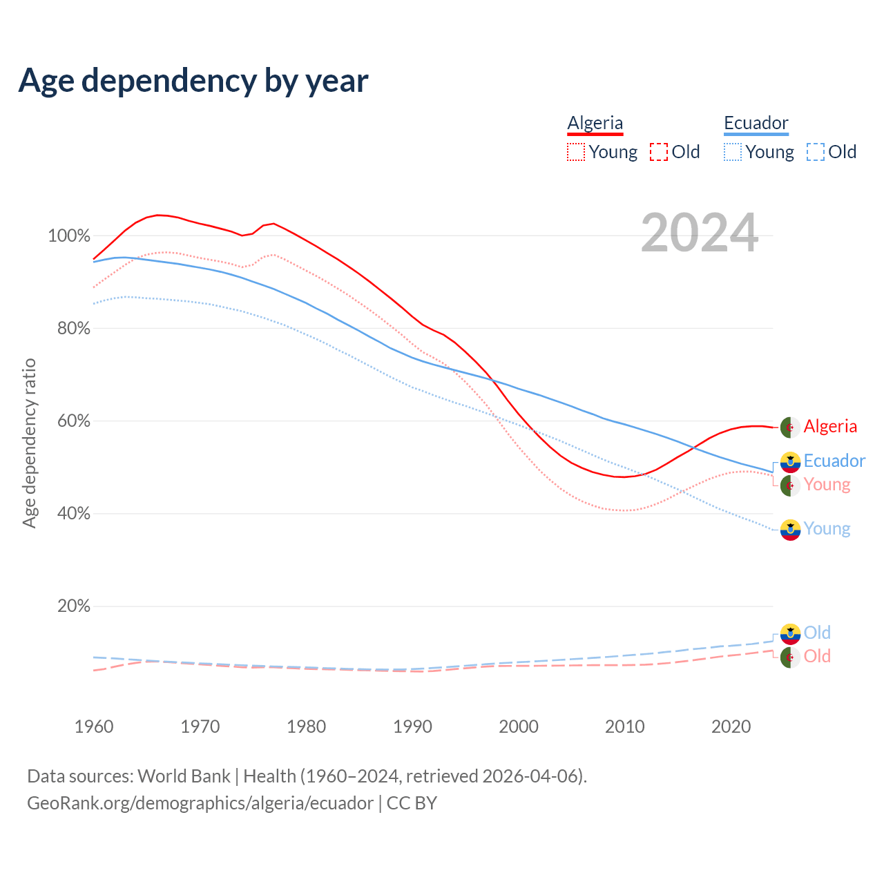 - The share of old-age demographic (65+) in Algeria is 6.58% vs 8.34% in Ecuador.
