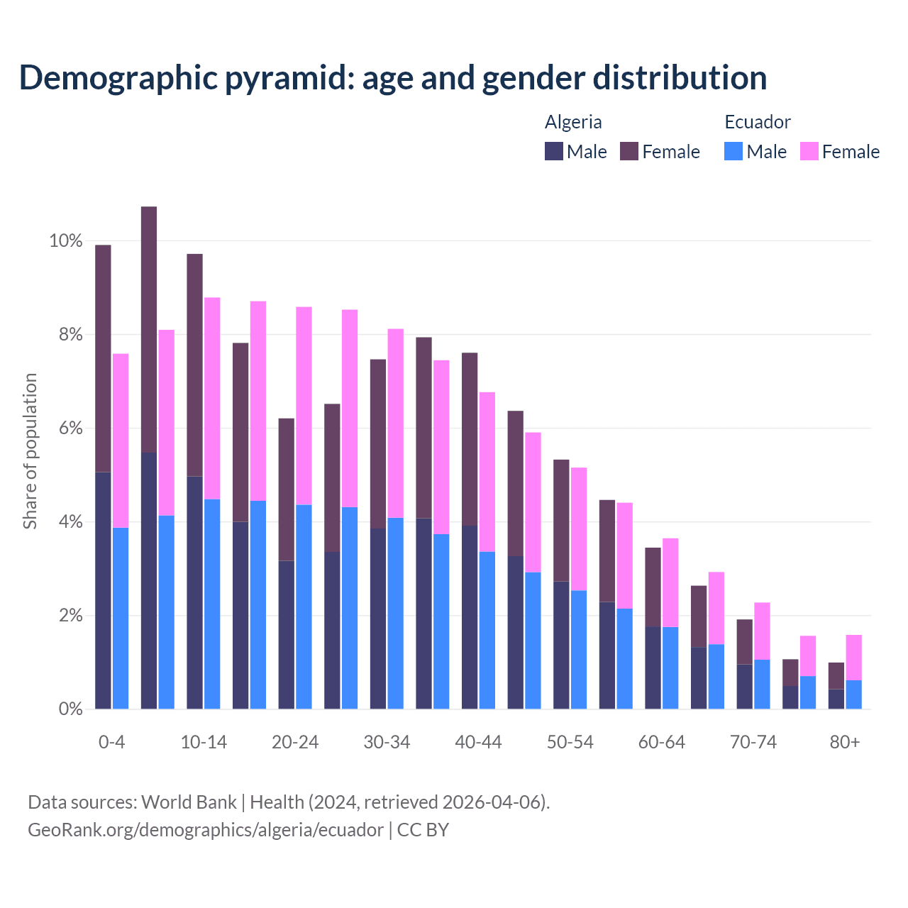 - Algeria is ranked 111/196 by median age (oldest to youngest) vs 105/196 for Ecuador.