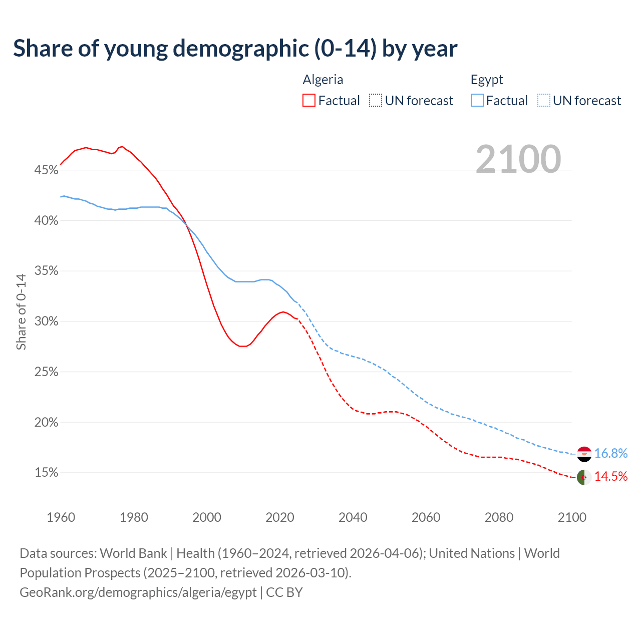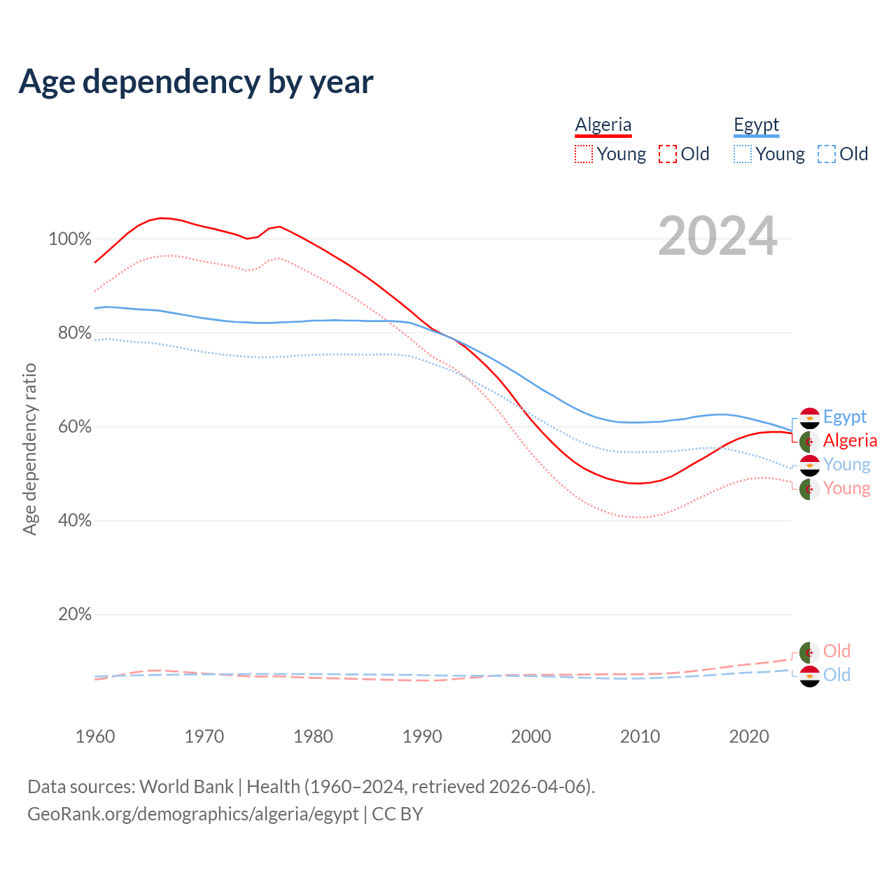 - Algeria is ranked 111/196 by median age (oldest to youngest) vs 133/196 for Egypt.