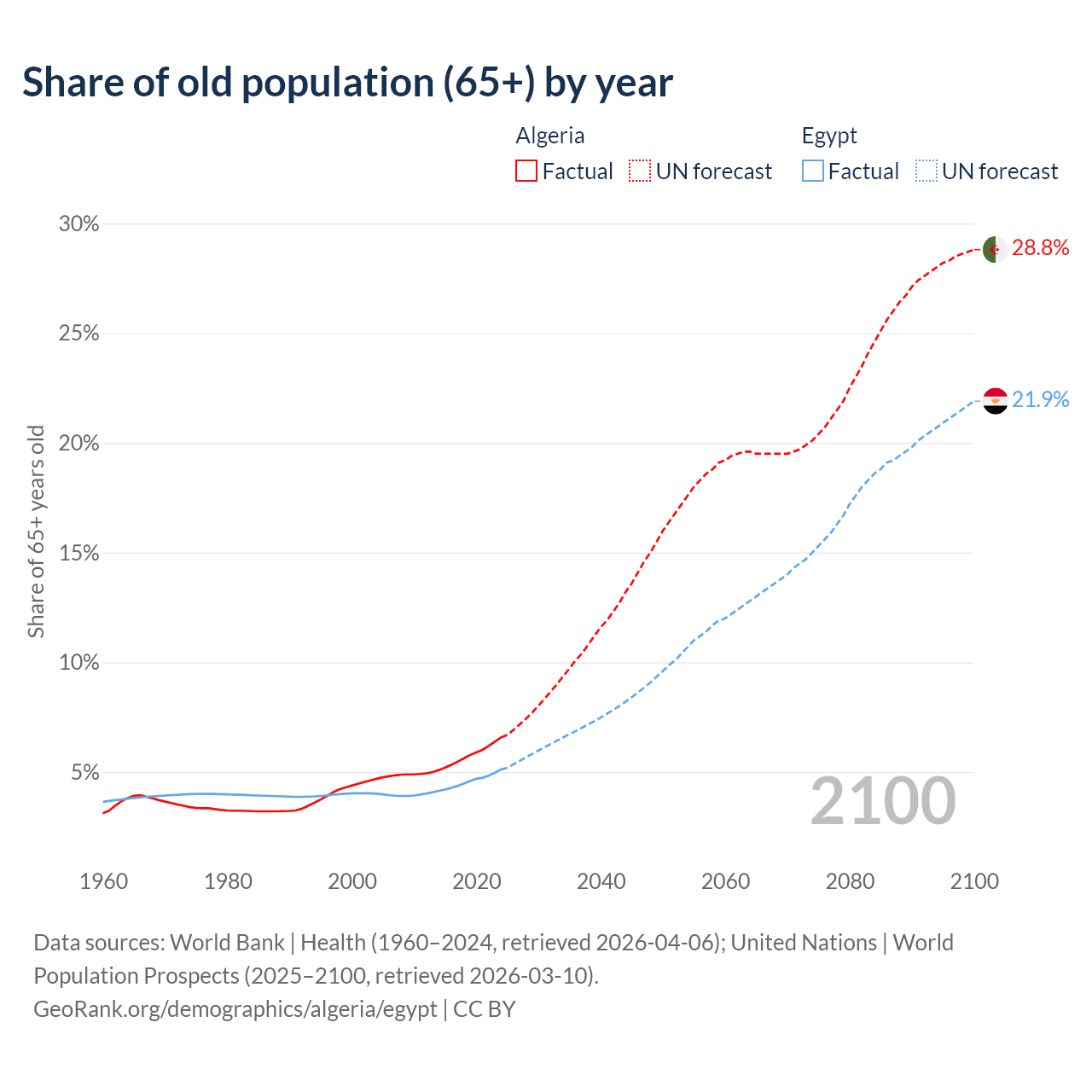 - The share of old-age demographic (65+) in Algeria is 6.58% vs 5.12% in Egypt.