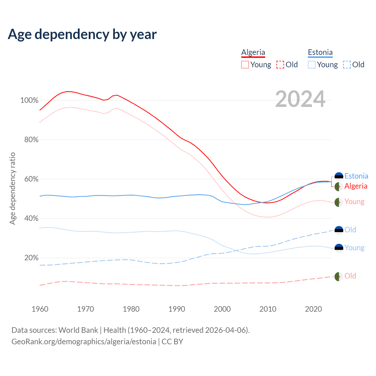 Data sources: World Bank | Health (1960–2024, retrieved 2026-04-06); U.S. Census Bureau (1960–2024, retrieved 2026-02-08).